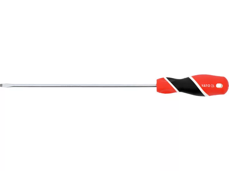 Flat screwdriver. Carrive heel, made of steel with the S2 symbol, hardened to about 58 HRC. The surface of the satin, the working tip is hardened and sandblasted / strengthens the stability of the grotto /. Handle made of properly selected materials of various hardness. For professional assembly works in various industries.