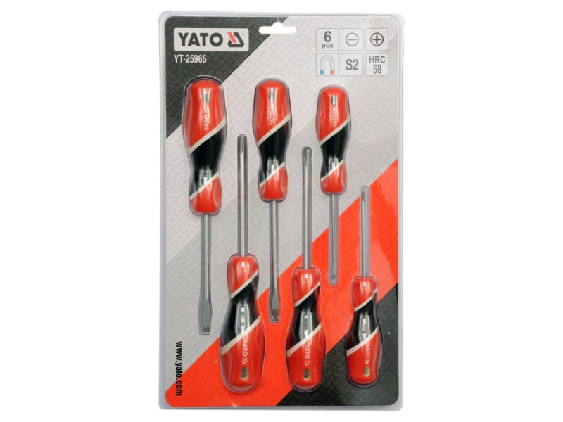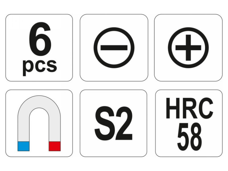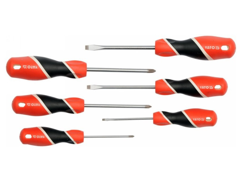 A set of six professional screwdrivers. District made of S2 symbol, hardened to about 58 HRC. The surface of the satin, the working tip is hardened and sandblasted / strengthens the stability of the grotto /. Handle made of properly selected materials with various hardness for professional assembly works in various industries.