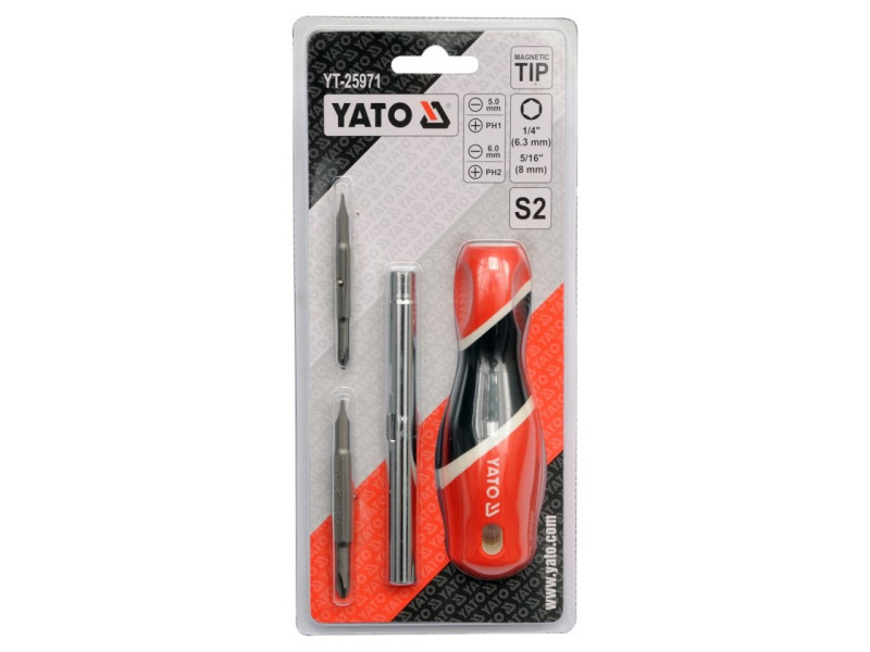 Screwdriver with replaceable tips. The set includes three double -sided caves with the most commonly used profiles made of S2 symbol. For service works and professional assembly.
