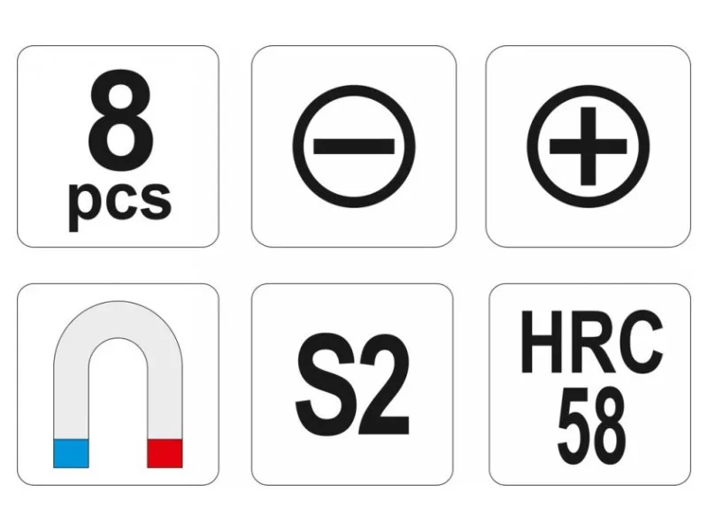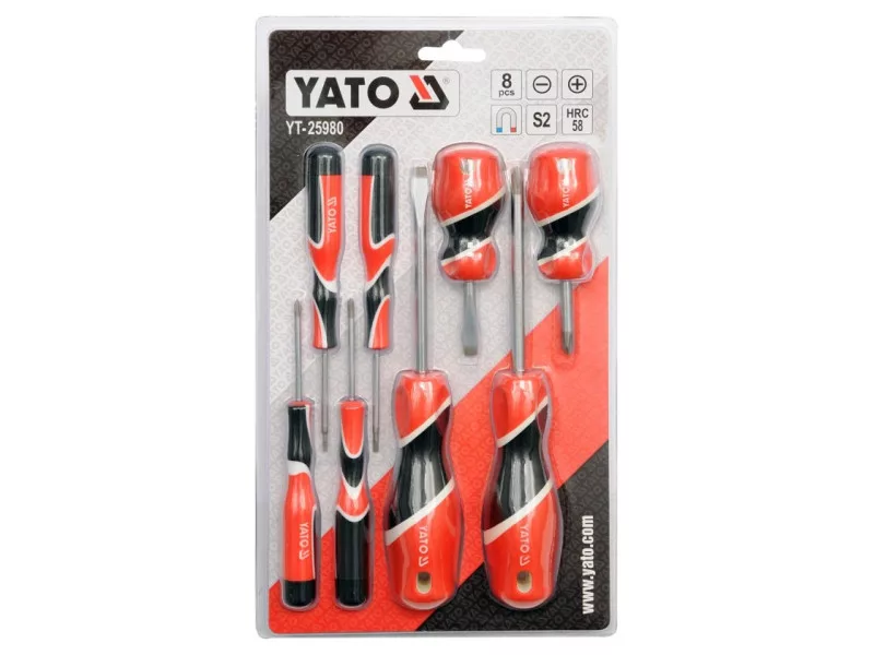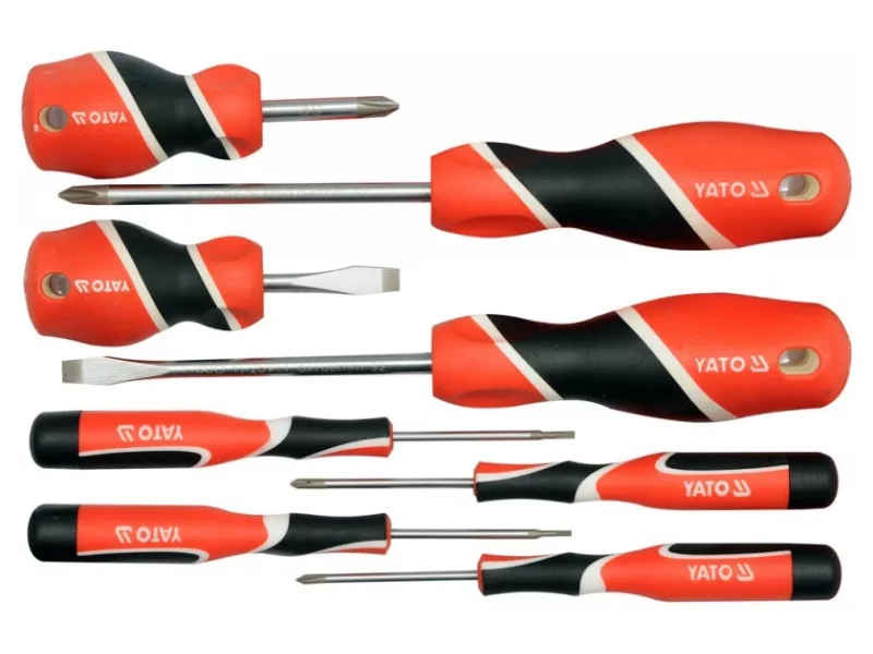 A set of eight professional screwdrivers. District made of steel with the S2 symbol, hardened to about 58 HRC. The surface of the satin, the working tip is hardened and sandblasted / strengthens the stability of the grotto /. Handle made of properly selected materials with various hardness for professional assembly works in various industries.