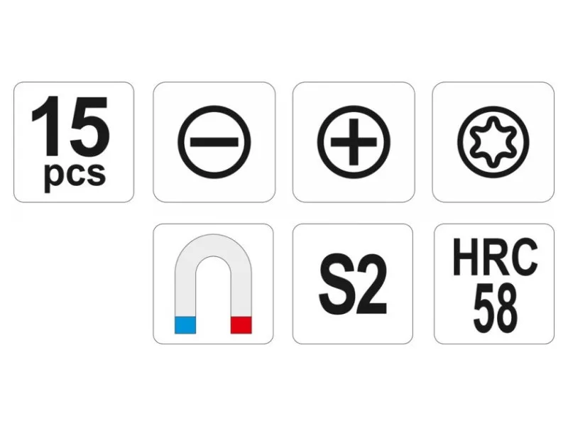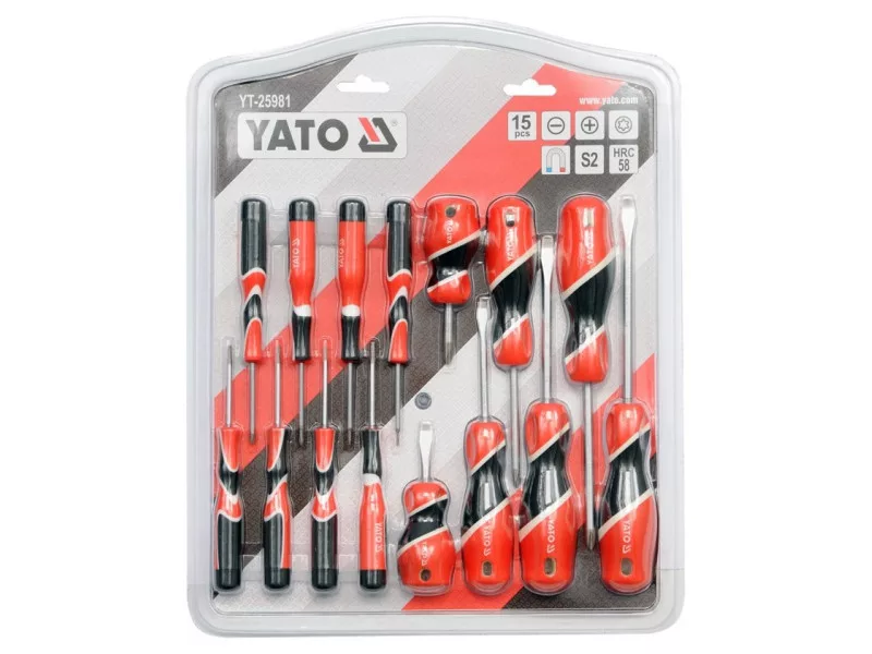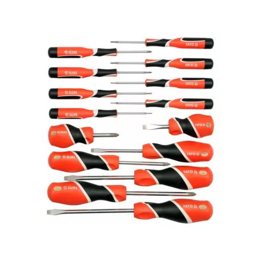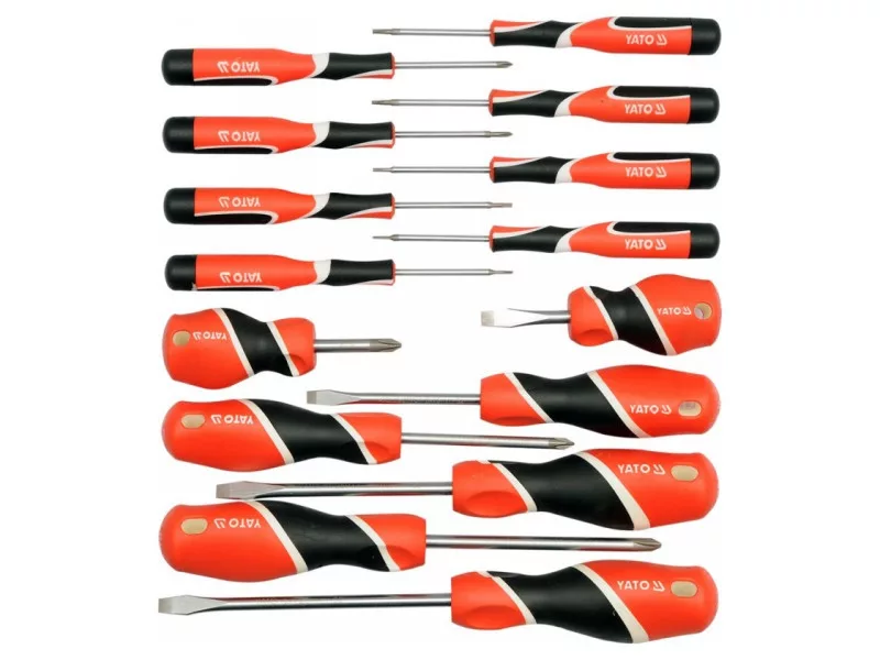 For professional assembly works in various industries. District made of steel with the S2 symbol, hardened to about 58 HRC. The surface of the satin, the working tip is hardened and sandblasted / strengthens the stability of the grotto /. Handle made of properly selected materials with various hardness for professional assembly works in various industries. Screwdrivers: flat: 6x125mm, 6x100mm, 6x38mm, 5x75mm, cross: PH2x100mm, pH2x38mm, pH1x75mm; Precise screwdrivers: flat: 1.5x50mm, 2x50mm, cross: PH00x50mm, PH0x50mm; Torx T5x50mm, T6x50mm, T7x50mm, T8x50mm;