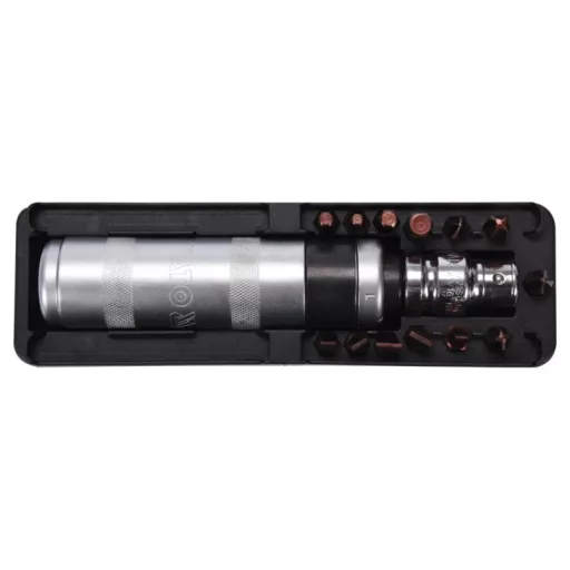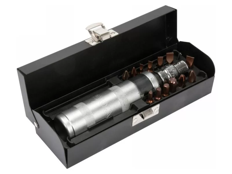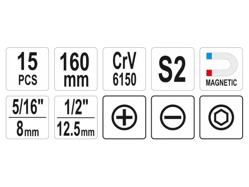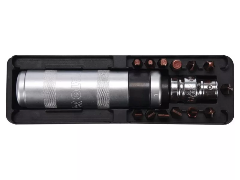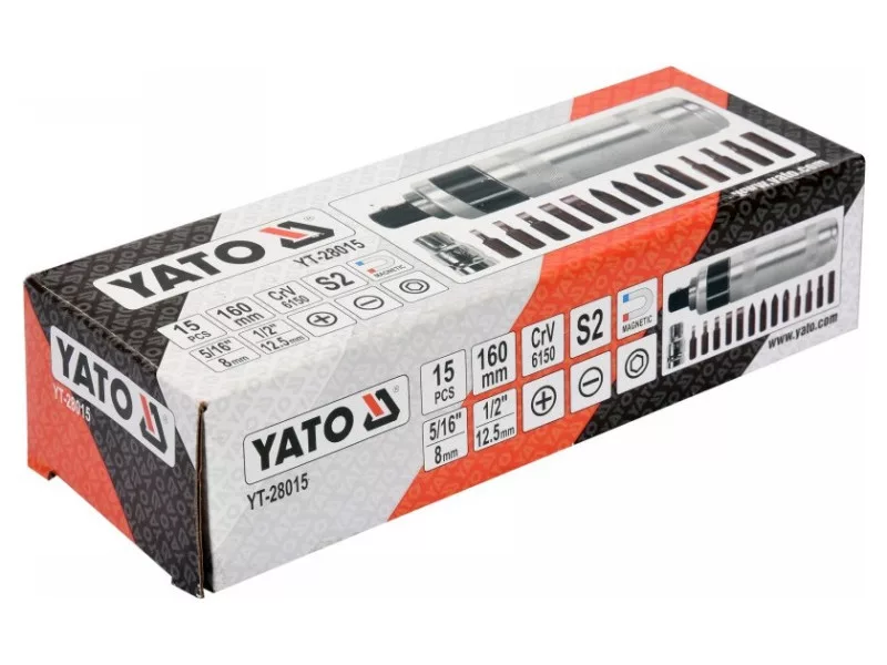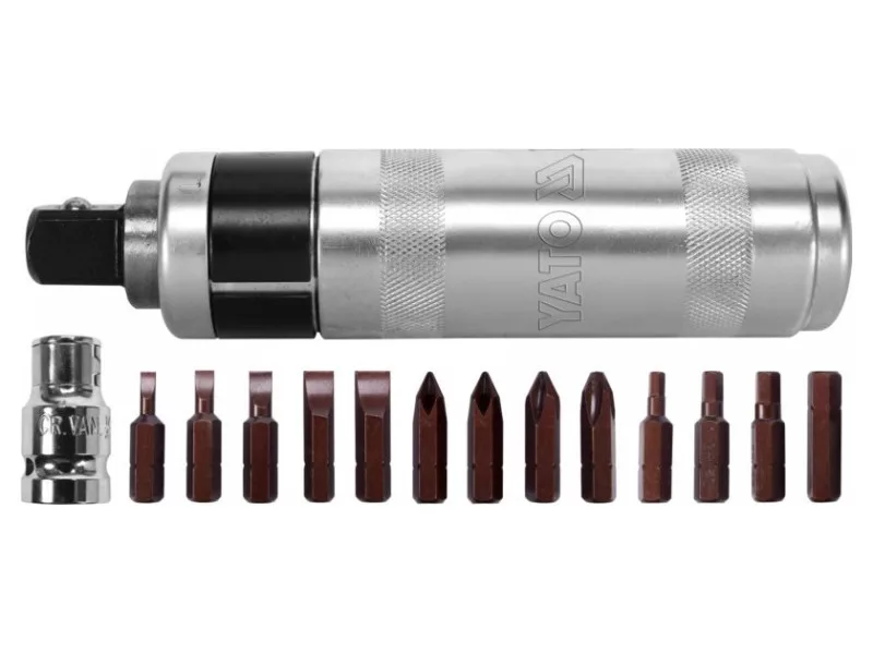 160mm long impact screwdriver with 13 black YATO YT-28015 tips. The screwdriver is made of durable CRV steel, resistant to deformation when hitting with a hammer, while bits from high quality S2 steel.