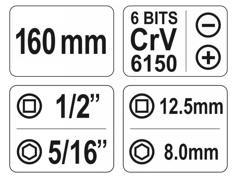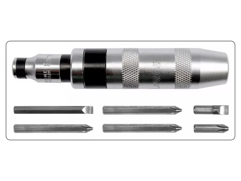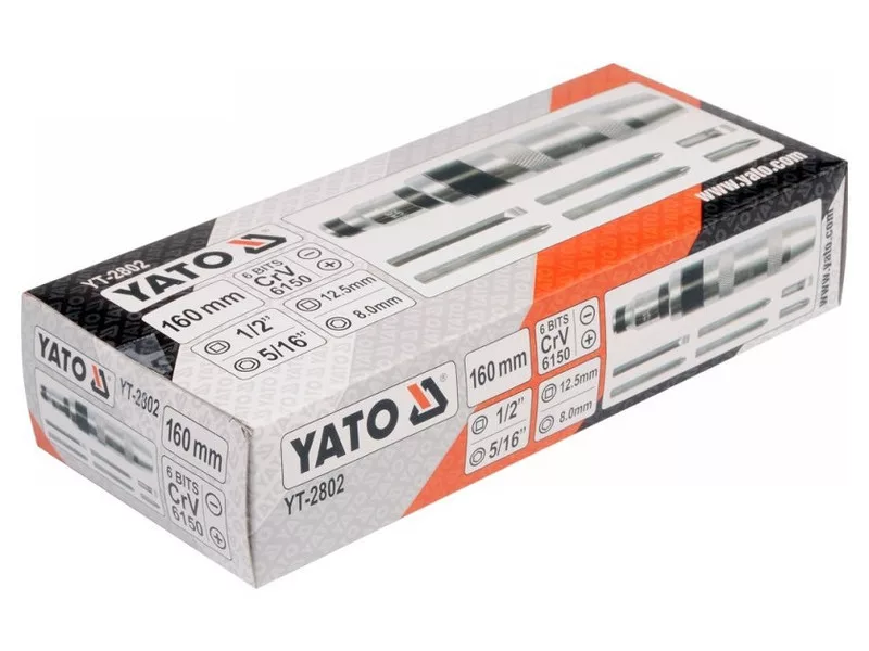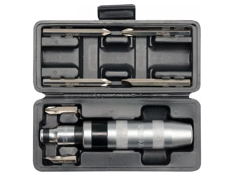 Yato brand impact screwdriver with a length of 160 mm with 6 bits in the set. The bits are made of durable CrV 6150 steel and the set is packed in a practical case.
