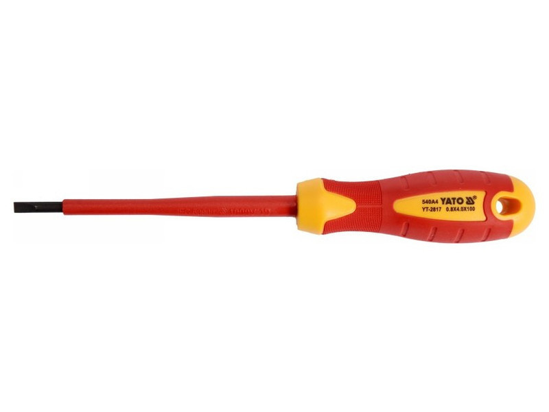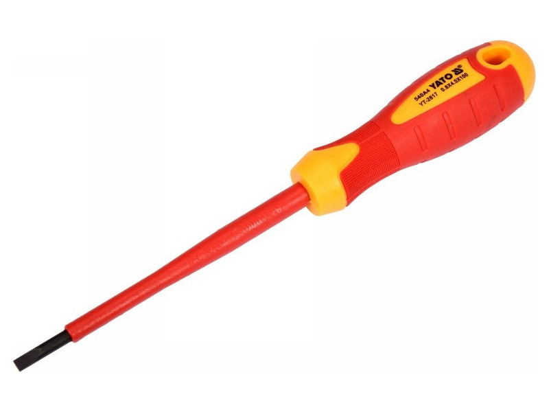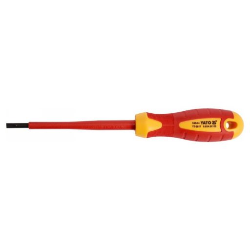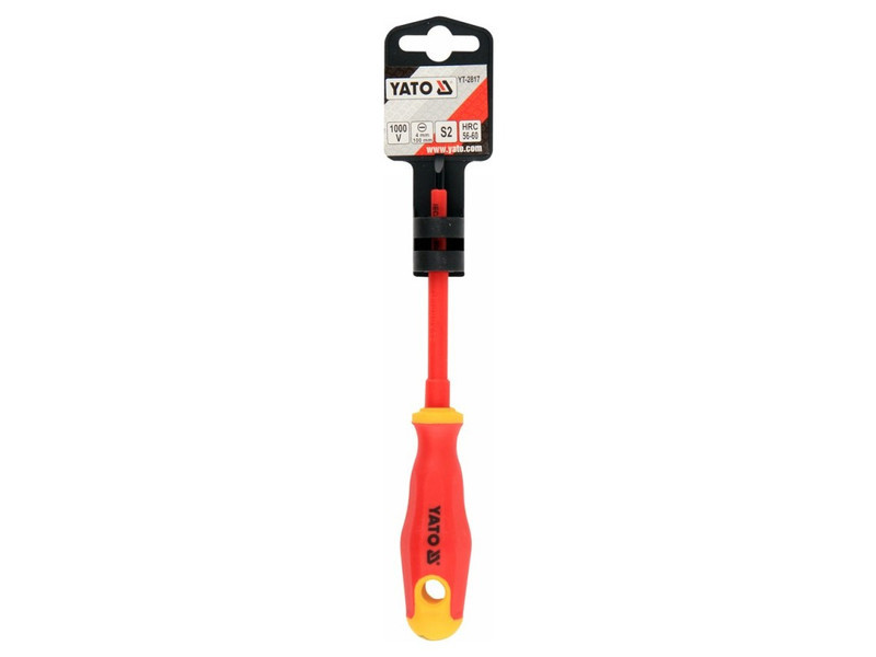 Flathead screwdriver YT-2817 with VDE insulation, made of durable S2 steel with hardness HRC 56-60.