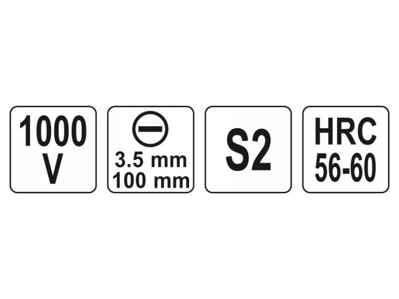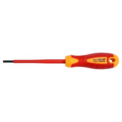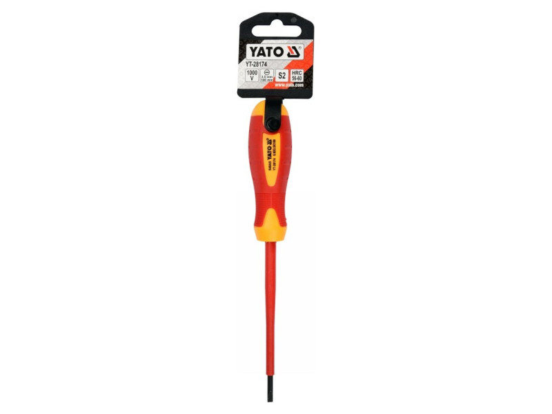 Flathead screwdriver YT-28174 with VDE insulation, made of durable S2 steel with hardness HRC 56-60.