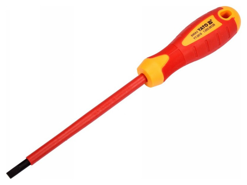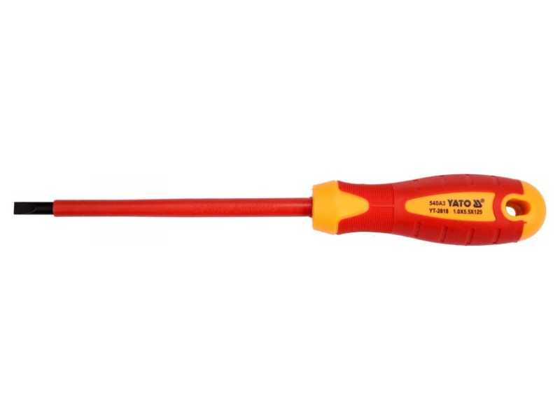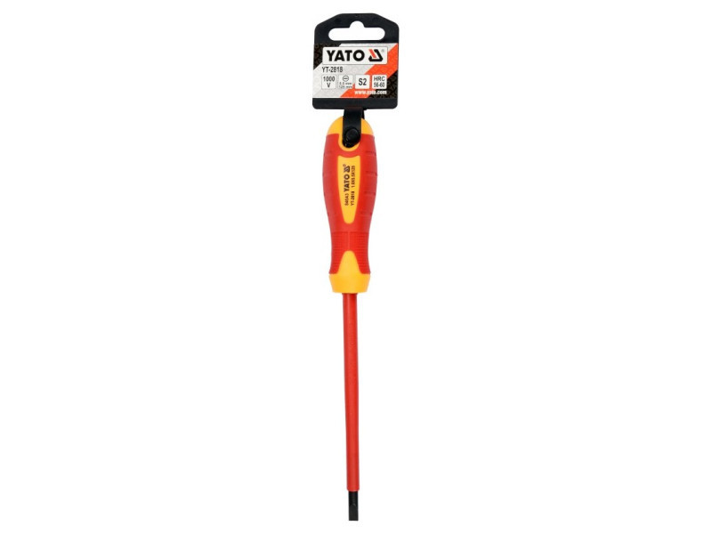 Flathead screwdriver YT-2818 with VDE insulation, made of durable S2 steel with hardness HRC 56-60.