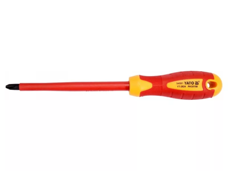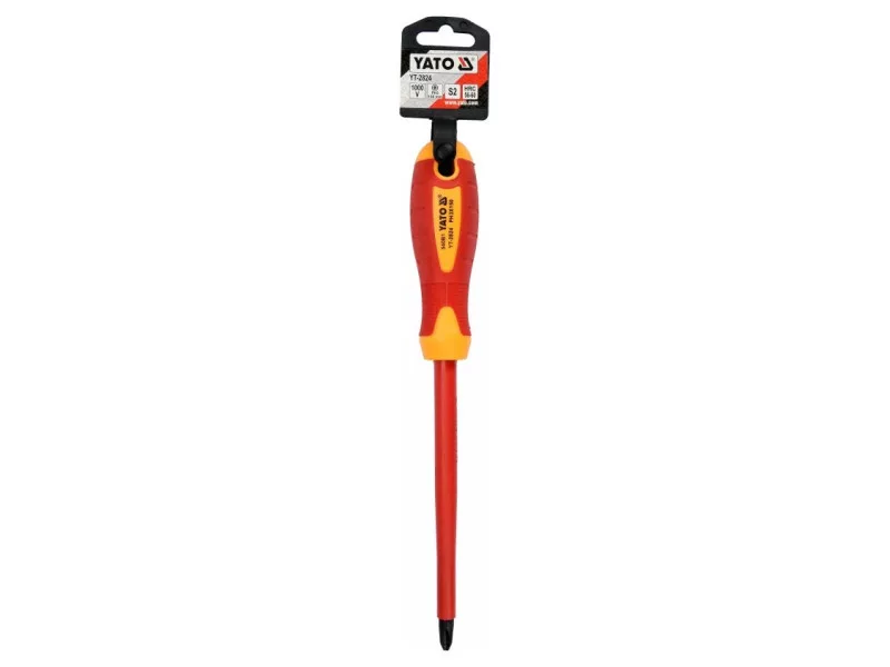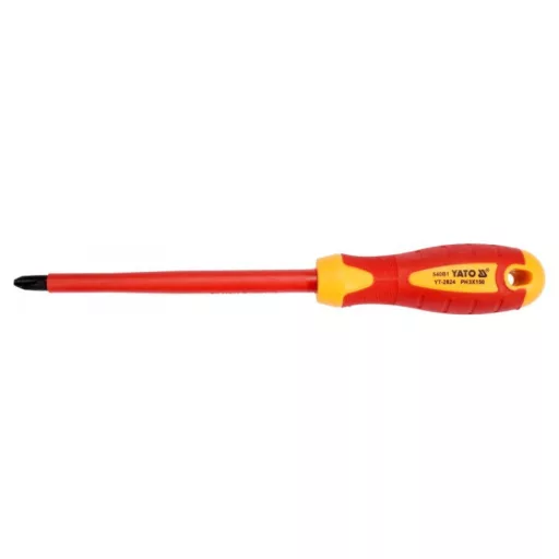 Cross head screwdriver YT-2824 with VDE insulation, made of durable S2 steel with hardness HRC 56-60.