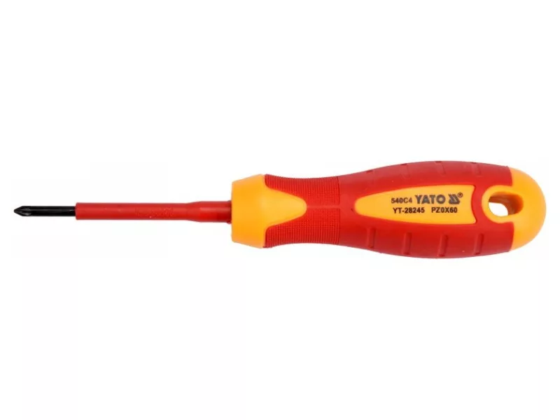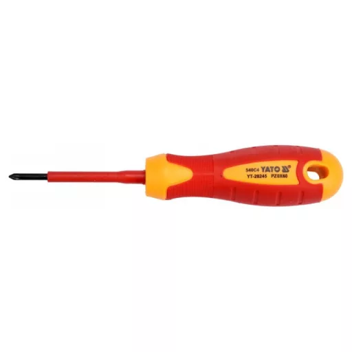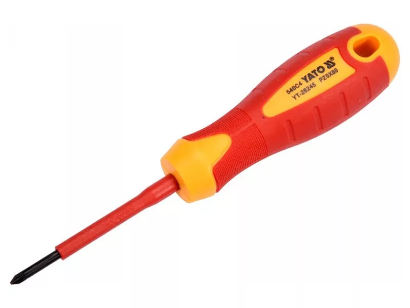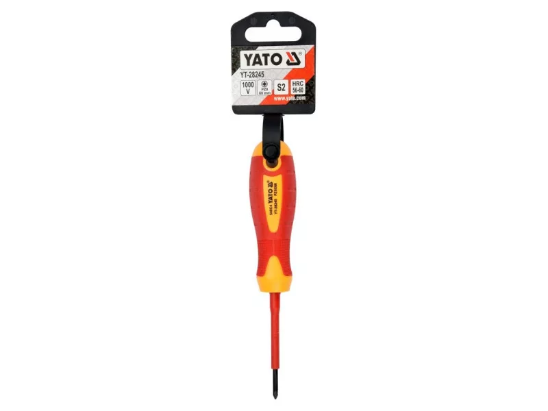 Cross head screwdriver YT-28245 with VDE insulation, made of durable S2 steel with hardness HRC 56-60.