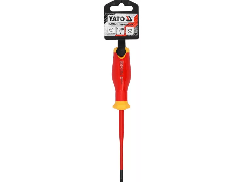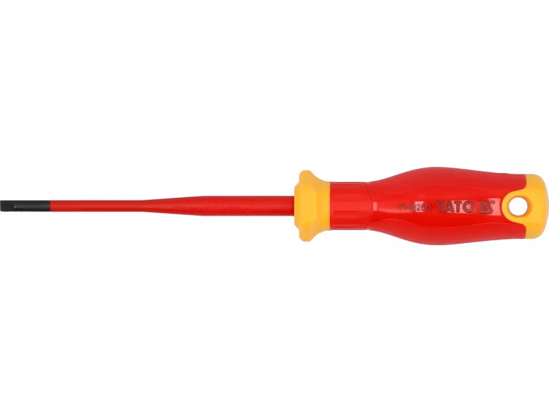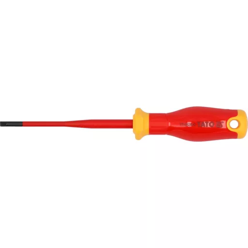 Insulated screwdriver from the slim series with a flat tip. The tapered shaft construction with fitted insulation allows for easy access to hard-to-reach places and ensures safe working under voltage up to 1000 V.