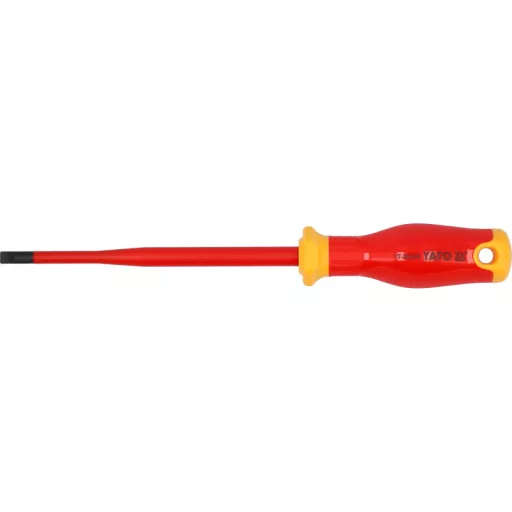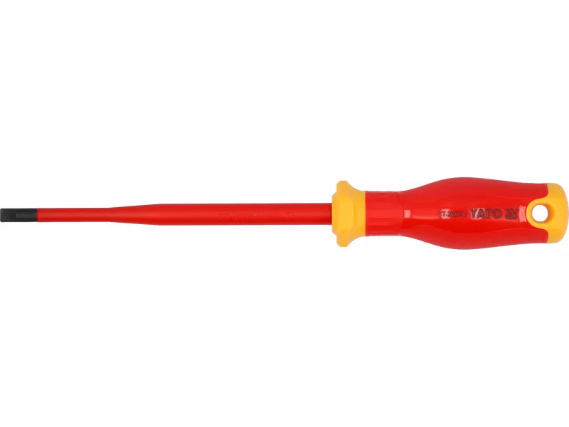 Insulated screwdriver from the slim series with a flat tip. The tapered shaft construction with fitted insulation allows for easy access to hard-to-reach places and ensures safe working under voltage up to 1000 V.