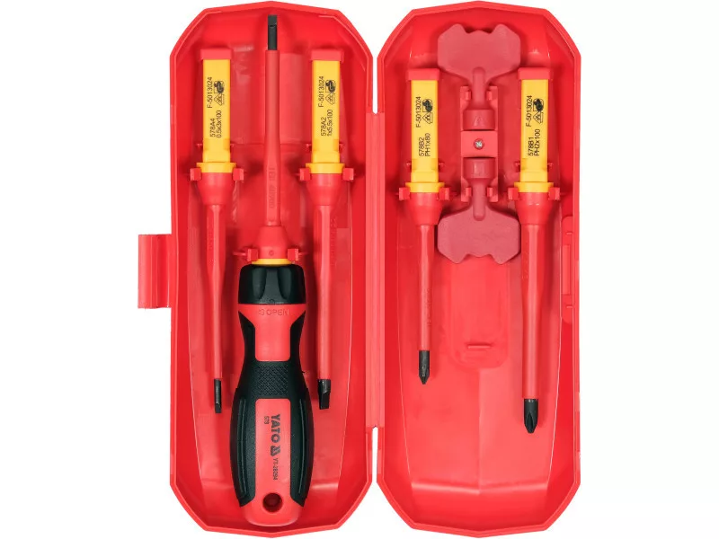Set of VDE insulated screwdrivers in the configuration of a handle and 5 interchangeable tips, as well as square and triangular wrenches for electrical boxes.