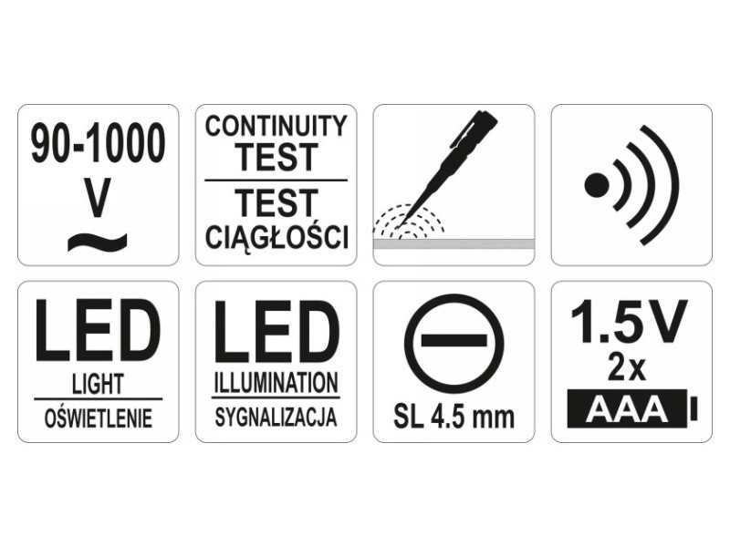 Designed to detect voltage in electrical wires in the range of 90-1000V. In addition, it allows you to perform a wire continuity test.