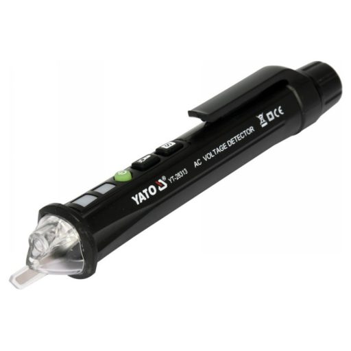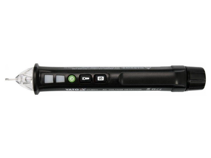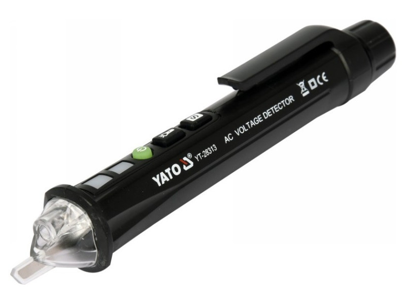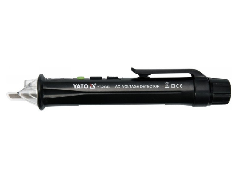 Inductive voltage próbnik YT-28313 enables detection of alternating voltage in electric wires in two ranges of 48-1000V and 12-1000V, as well as detection of a break in a live wire. The elimination of direct contact between the blade and the isolated wire increases the safety of use. Voltage detection is indicated by an LED and an audible signal.
