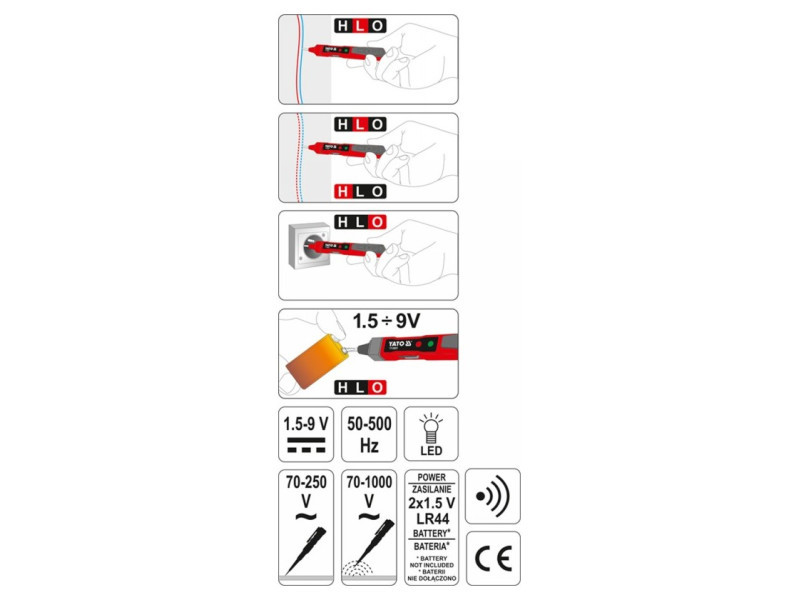 Allows non-contact detection of AC voltage, róalso under plaster. For example, to check the presence of voltage in an insulated wire, set the tester to the [L] position. Then, holding the blade, bring the metal contact from the gór part of the handle close to the insulated wire. The illumination of the green LED and a beep will inform you of the presence of voltage in the wire under test. You can increase the sensitivity of the method by switching the button from [L] to [H]. This method also allows „non-contact” detection of a break in a live electric wire. At the point of the break, the tester will stop signaling the presence of voltage. Można również odwrócić tester i szukać napięcia za pomocą końcówki grota. However, when searching for wiresóunder plaster, be careful not to scratch the wall.