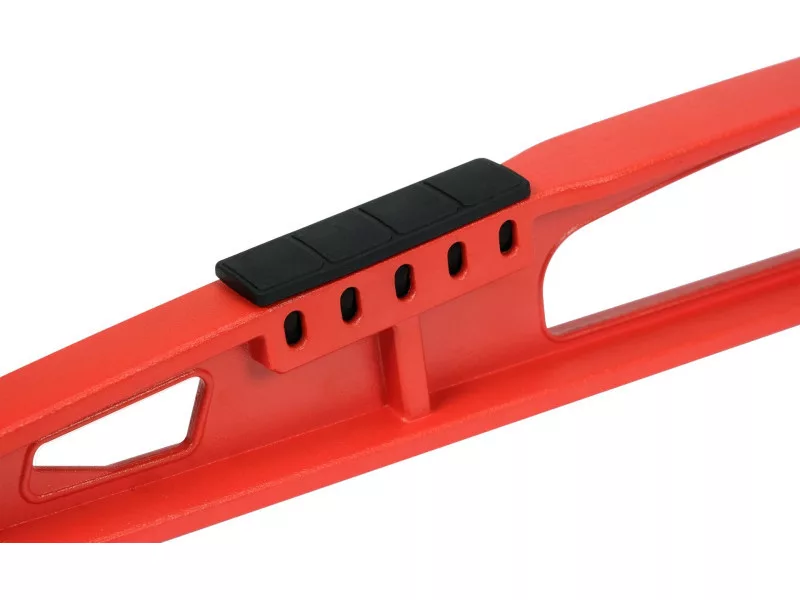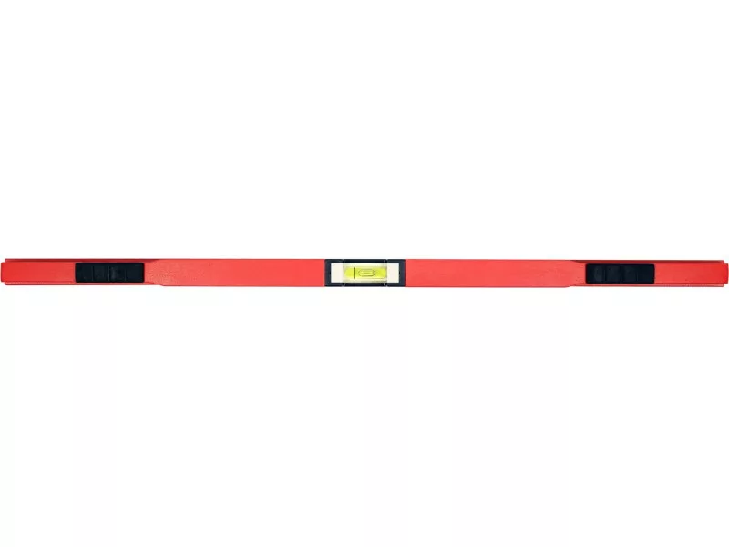 Shock-resistant spirit level made of cast aluminium. The profile has an openwork construction with walls approx. 5 mm thick. The vertical and horizontal vials are embedded in TPR covers. Two fields with TPR inserts on the top side of the profile are designed for beating the spirit level when levelling the tiles.