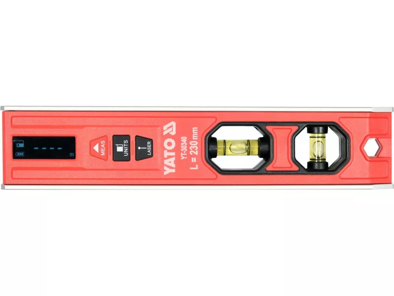 Electronic torpedo level 230 mm with laser for distance measurement and horizontal or vertical line determination. The rangefinder can operate in stationary or dynamic mode (changing distance during measurement). Can be measured from the front or rear edge. The results are displayed on the LCD screen. A groove (prism) is cut into the upper plane of the housing. The spirit level has two glass vials that can be illuminated independently of each other. There are 3 strong magnets mounted in the base. Body made of aluminium section, housing made of ABS.
