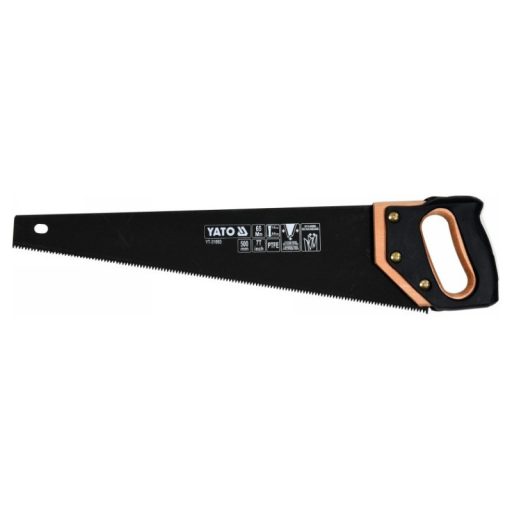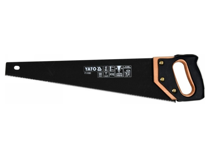 Hand saw, so called "planer", for cutting wood and wood-based materials such as plywood, chipboard, mdf. Blade made of steel sheet with manganese addition (Mn 65) with high resistance to abrasion and deformation Blade surface covered with ptfe layer reducing friction during cutting Teeth with three-sided profile, adapted to aggressive, effective cutting in both directions High rigidity of sheet and teeth with 7 tpi pitch enable effective, fast and precise cutting Blade thickness: 1 mm Wooden handle, sheathed in protective thick rubber The handle profile allows 45° and 90° angles to be scribed on the material to be cut For fast cutting of wood and wood-based materials.