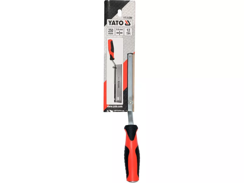 Precise cutting saw at the wall with a laid, robbed handle. Total length 410 mm, blade length 250 mm, height 60 mm, thickness 0.5 mm. Handle put into both ends, fastened in the middle on the nets. Tempered teeth 12 TPI scale. Two -component handle. A ball intended for carpentry and modeling works. The layered handle allows cutting directly on vertical walls or cutting elements on flat surfaces, e.g. wooden dowels.