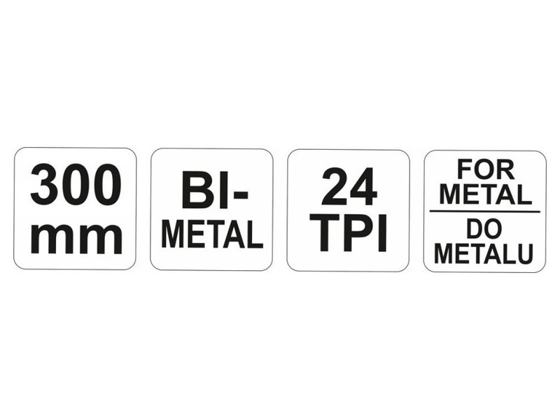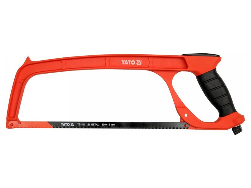 Frame frame for metal l 300 mm, made of pressure cast aluminum. Thanks to a special profile and embossing, extremely light and stiff. The handle closed with polypropylene handle, protects the operator's hand against accidental injury. Effective blade tension with a knob at the bottom of the handle. The surface is covered with plastic. Includes a 300 x 12 mm bimetal blade, 24 TPI. For cutting rods, tubes, angles and other elements made of steel and colored metals.