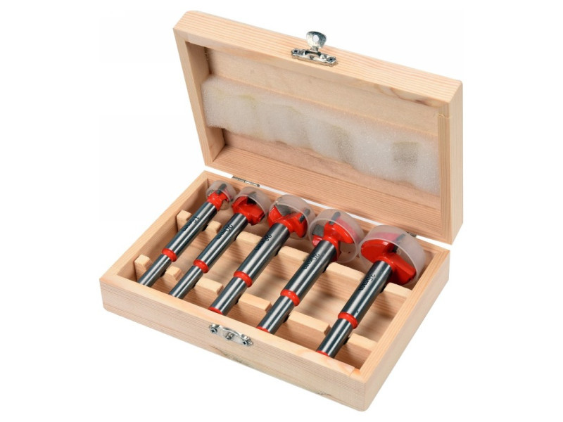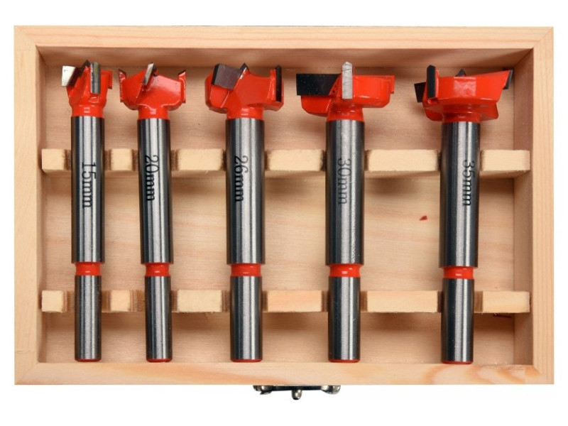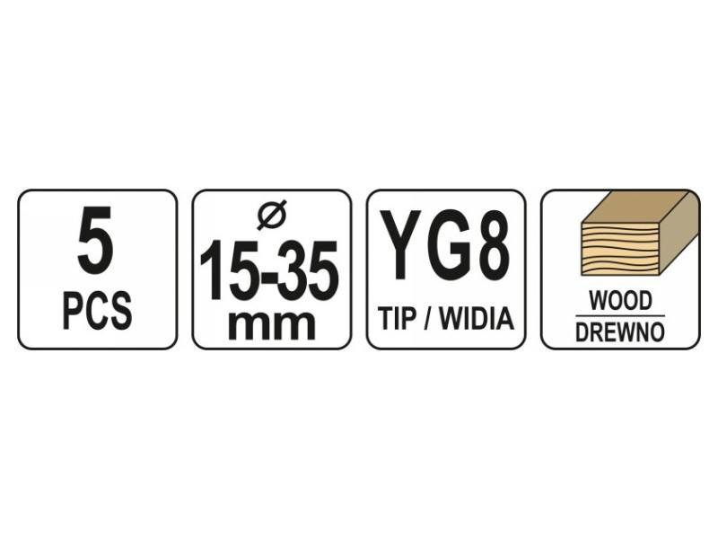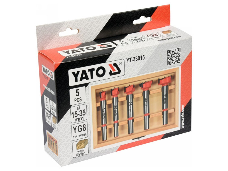 Set of wood drills for Yato YT-33015 hinges. Designed for drilling precise holes without jerking the edges in soft wood, plywood, plastic. • Made of hardened, high -quality steel • Widia with Steel YG8 • drilling in any direction. 2 drills with a 8 mm handle with diameters 15, 20 mm 3 drill with a 10 mm handle with diameters 26, 30, 35 mm