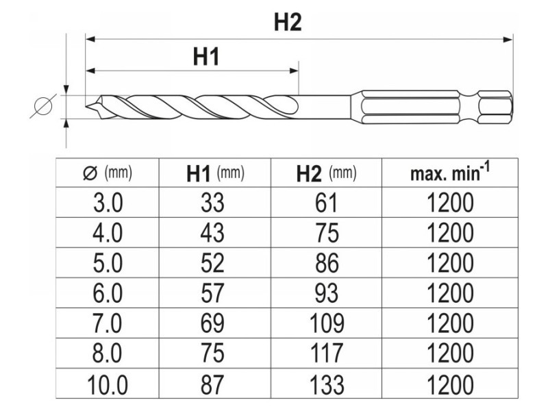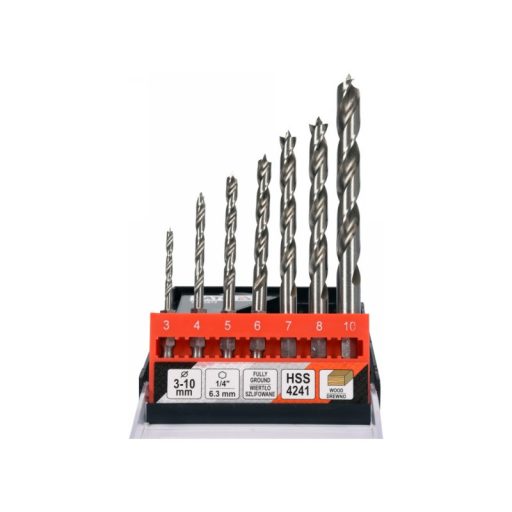 Set of spiral wood drill bits designed for professional use. Useful for drilling in soft and hard wood, plywood and chipboard, carpentry and wood fiberboard.