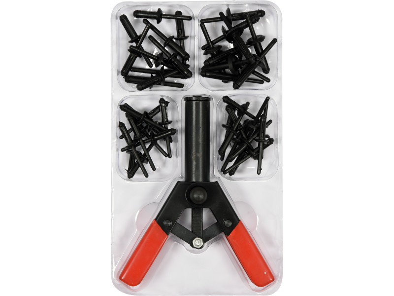 Set includesriveter, plastic rivets x40 (5x15.8 mm x10, 5x17.2 mm x10, 6.3x25.2 mm x10, 6.6x17.2 mm x10)