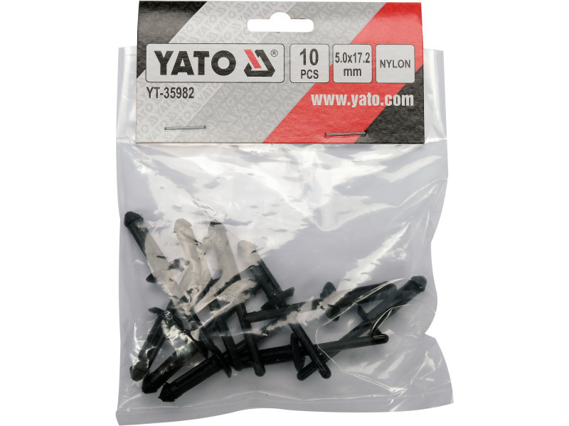 Set of 10 pieces of plastic rivetsó size 5.0 x 17.2 mm. Designed for attaching, among other things, plastic moldings, car liners, upholstery, engine covers, wheel arches.