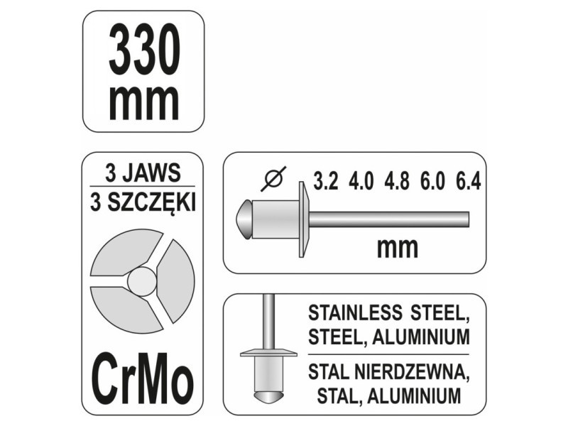 | Rivets diameter | 3.2, 4, 4.8, 6, 6.4 mm |