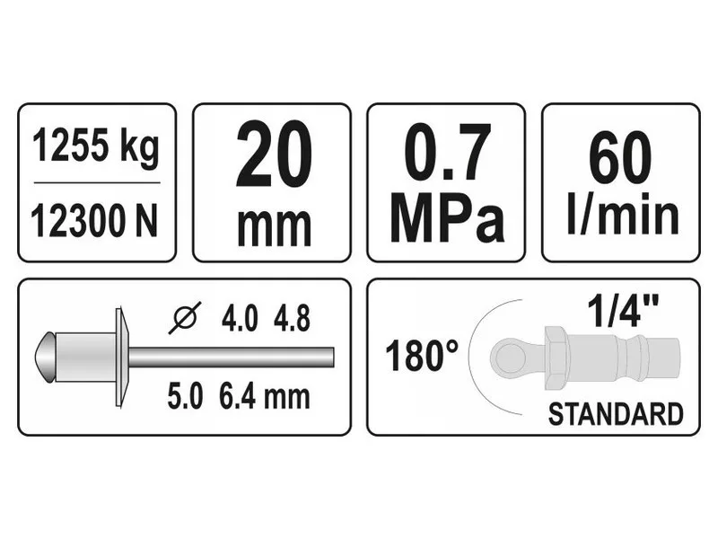 | Rivets diameter | 4, 4.8, 5, 5.4, 6, 6.4 mm |