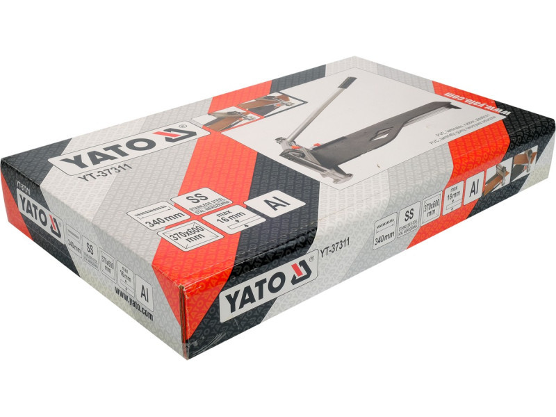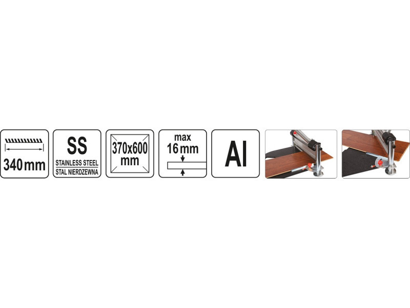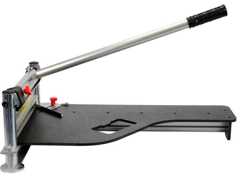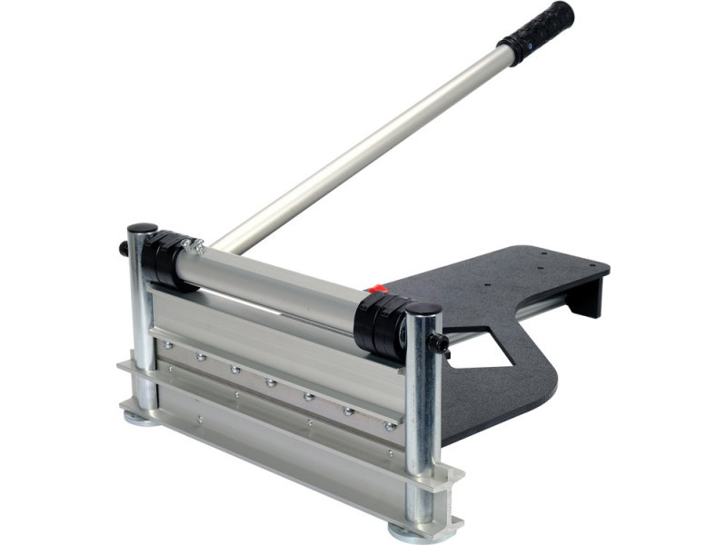 Gilotine for cutting floor panels, cutting width 340 mm, max. The thickness of the cut material is 16 mm. The guillotine knife is embedded in aluminum profiles, fastened on vertical, steel pedestals. The pressure arm is about 600 mm long, the worktop made of hard, wear -resistant plastic has dimensions of 370 mm x 600 mm. Attention, the guillotine knife is extremely sharp and care should be taken. A guillotine for cutting floor panels and other similar finishing materials up to 16 mm thick. Place the processed material on the top of the device, between the plugs fastening the knife. Then, pressing the levers to leave the blade on the material and pressing the desired fragment. Due to the exceptional sharpness of the knife, special attention should be paid during operation.