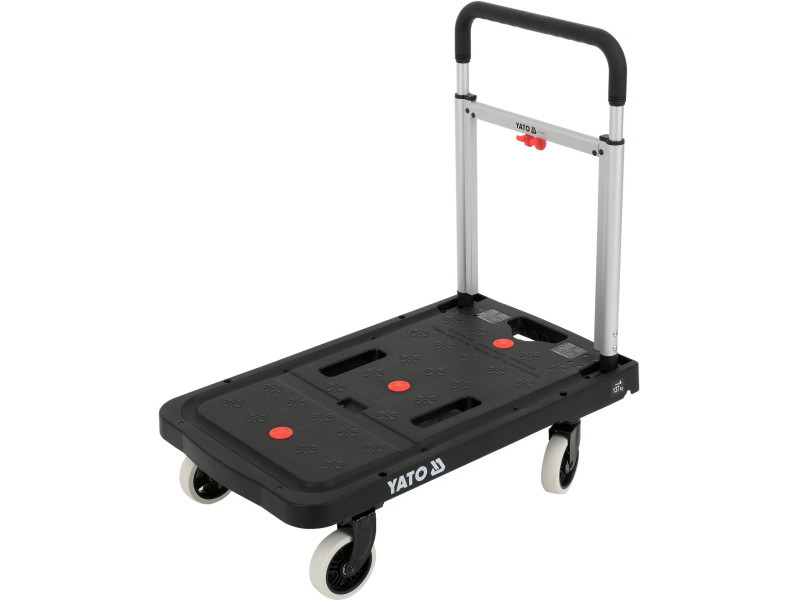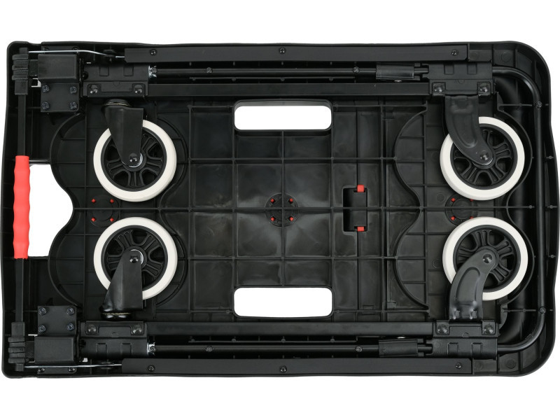 The extendable handle made of durable TPR material provides a comfortable grip and user comfort. The trolley can be folded into compact dimensions of 41 x 8.4 x 67.5 cm, making it easier to store in a workshop, warehouse, or car. When unfolded, it reaches dimensions of 67.5 x 41 x 92 cm, offering a stable and comfortable transport surface.