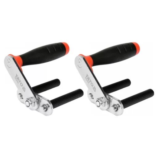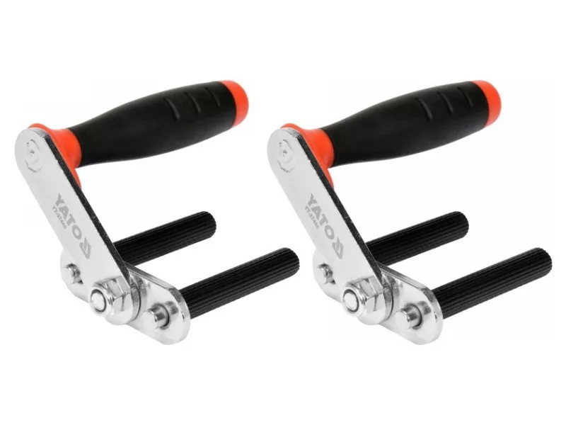 Professional handle for carrying plasterboard made of steel , coated with plastic . Thoughtful and proven in action design results in self-strong clamping of the handle on the carried board. Clamp handles , are designed for carrying the plates by two people. The set includes two handles. In addition to gypsum boards, using the grips you can safely carry any wood panels, or doors.