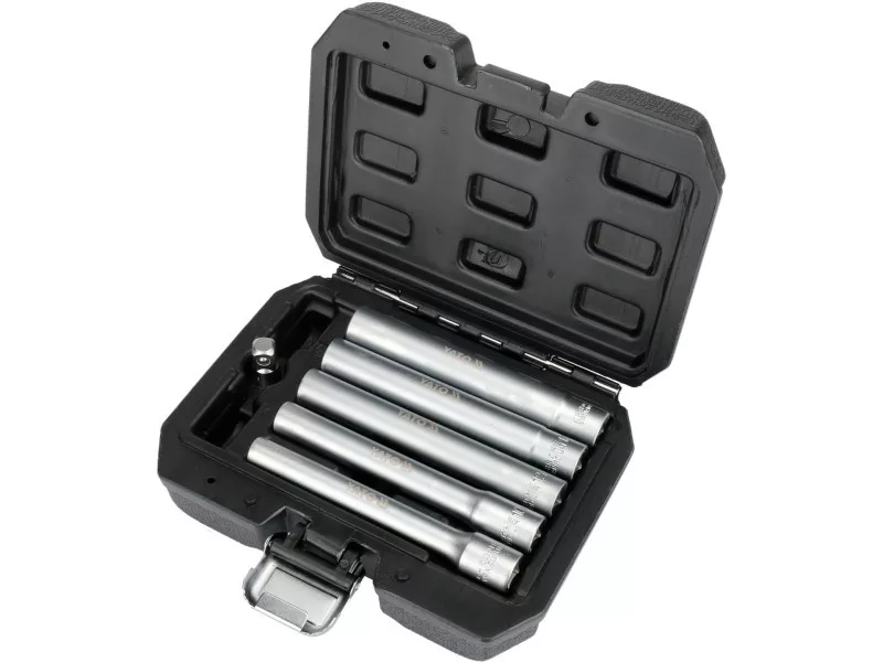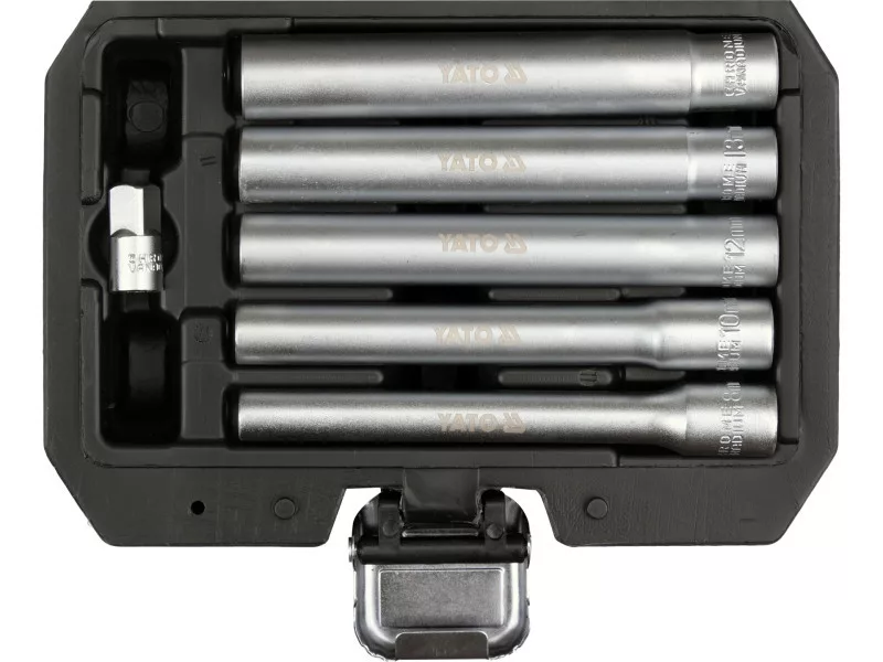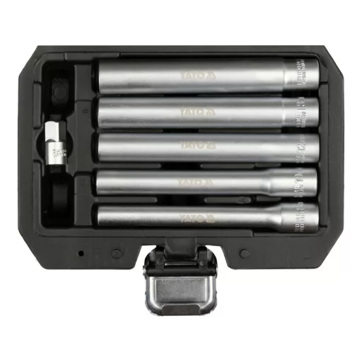 A professional set of five extended sockets in popular sizes: 8, 10, 12, 13, 14 mm. Designed for loosening deeply seated screws and nuts, e.g. on bumpers, rear lights, door hinges, body panels. Ideal for work in hard-to-reach places, particularly useful for adjusting the handbrake cable in VAG, Opel, Vauxhall, BMW, and Ford vehicles.