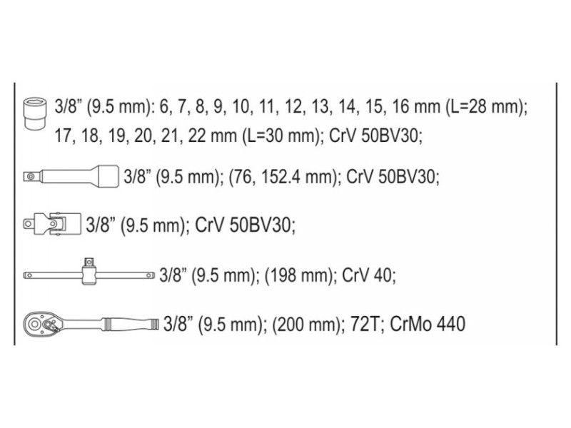• 3/8” (9.5 mm) ratchet: 200 mm; 72T