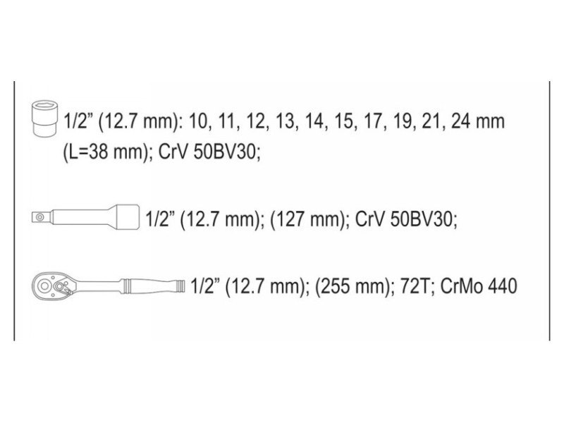 • Socket wrenches and drive made of durable chrome-vanadium steel CrV 50BV3