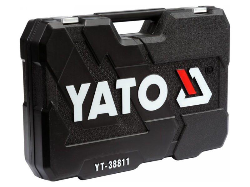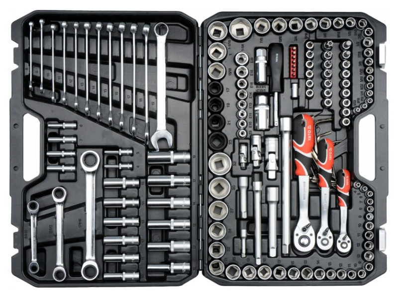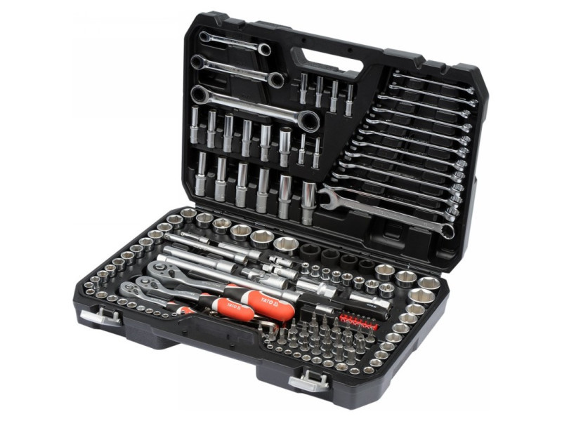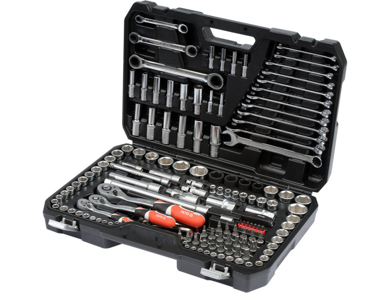 A professional tool set, which was developed for the needs of specialized car and mechanical services. The socket wrenches and the drive of the attachment were made of durable, tool-vanadium steel CRV 50BV3. The attachments were made using the matrix method, and before the hardening process they were calibrated with precise fittings and control devices. The attachments equipped with the AS-Drive system, increasing the maximum moment by 25%, with full protection of the cutter of the caps, the attachment with a two-tone surface finish. The kit also includes bits made of hard S2 steel. The set enables work that requires very high loads and precision, allows you to perform many service activities related to unscrewing and screwing threaded connections of various nominal sizes. Ratches have a triangular handle and 72 teeth (5 degrees working stroke). 1/2 "attachments: 20; 21; 22; 24 mm, l = 38 mm, 27; 30; 32 mm, l = 42 mm caps ½" 17; 19; 21; 23mm long caps 1/2 ": 10; 12; 13; 14; 17; 19 mm, l = 76 mm 1/2 "caps: 15/16"; 1 ""; 1-1/16 "; 1-1/4" "" 3/8 "attachment: 9, 10; 11; 12; 13; 14; 15; 16 mm, L = 28 mm; 17; 18; 19 mm, l = 30 mm long 3/8 ": 10; 11; 12; 13; 14; 15 mm, l = 63 mm 3/8" caps: 3/8 ""; 7/16 ""; 1/2 ""; 9/16 ""; 5/8 ""; 11/16 ""; 3/4 ""; 13/16 ""; 7/8 "" caps 3/8 "TORX: E8; E10; E11; E12; E14; E16; E18; E20 Pods 1/4": 4; 5; 6; 7; 8; 9; 10; 11; 12; 13 mm, L = 25 mm long 1/4 ": 4; 5; 6; 7; 8; 9 mm, l = 50 mm caps 1/4" inch: 5/32 ""; 3/16 ""; 7/32 ""; 1/4 ""; 9/32 ""; 5/16 ""; 11/32 ""; 3/8 ""; 7/16 ""; 1/2 ""; Ratrotka 1/2 ": 72t, 255 mm ratchet 3/8": 72t, 200 mm ratchet 1/4 ": 72t, 155 mm screwdriver knob 1/4", 150 mm extension 1/2 ": 127 mm; 254 mm 3/8 "extensions: 76 mm; 152.4 mm 1/4 "extensions: 50.8 mm 3/8 candle caps: 16; 21 mm Cardana joint: 1/2 "; 3/8" "and 1/4" "" Bitts of bits 1/4 "TORX: T10; T15; T20; T25; T27; T30; T40 TORX screw tips on the 3/8 "attachment: T20; T30; T40; T45; T50; T55; T60 Philips screwdrivers on the 3/8": PH1; PH2 PH3 Cross -screw tips on the 3/8 "switch: PZ1; PZ2, PZ3 Flat screwdriver on the 3/8": 4, 5.5; 6.5 mm hexagonal screwdriver on the 3/8 ": 3; 4; 5; 6; 6, 10 mm Muscular keys: 8; 9; 10; 11; 12; 13; 14; 15; 16; 17; 18; 19 mm eyelets with a ratchet: 8x10; 12x13; 17x19 mm Allen keys: 1.5; 2; 2.5; 3; 4; 5; 6; 7; 8; 8; 10 mm