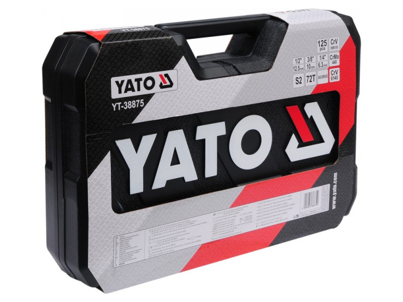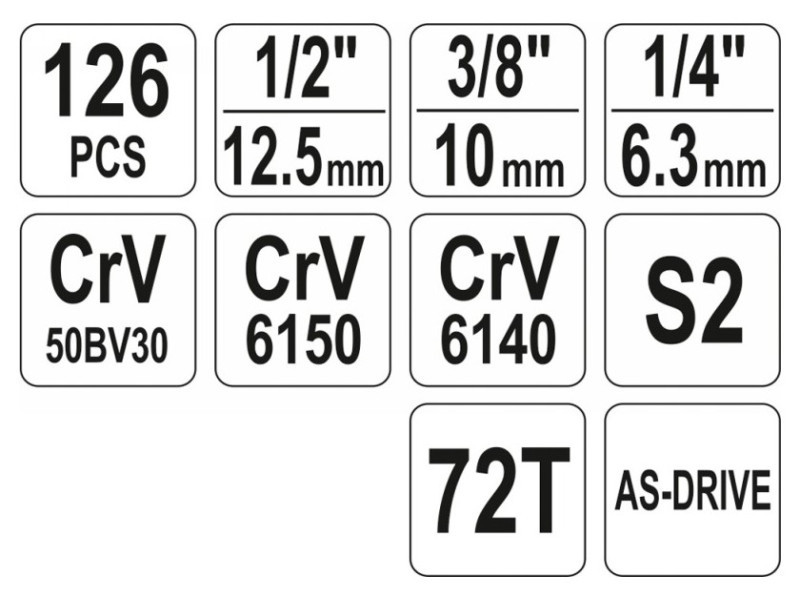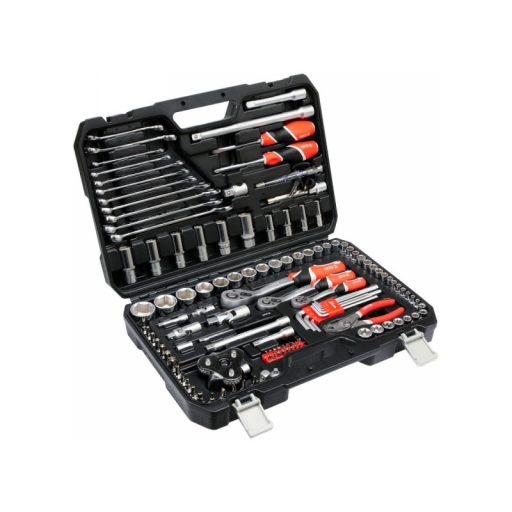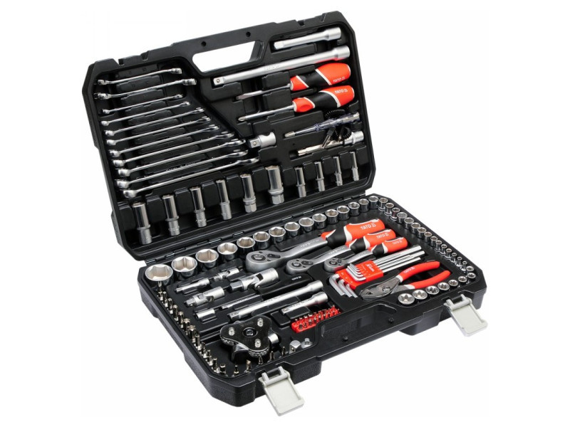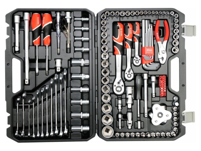 A professional tool set, which was developed for the needs of specialized car and mechanical services. The socket wrenches and the drive of the attachment were made of durable, tool-vanadium steel CRV 50BV3. The attachments were made using the matrix method, and before the hardening process they were calibrated with precise fittings and control devices. The attachments equipped with the AS-Drive system, increasing the maximum moment by 25%, with full protection of the cutter of the caps, the attachment with a two-tone surface finish. The kit also includes bits made of hard S2 steel. The set enables work that requires very high loads and precision, allows you to perform many service activities related to unscrewing and screwing threaded connections of various nominal sizes. Ratches have a triangular handle and 72 teeth (5 degrees working stroke). 1/2 "caps (12.7 mm): 20; 21; 22; 24 mm, L = 38 mm; 27; 30; 32 mm, L = 42 mm 3/8" (9.5 mm) attachment: 9 ; 10; 11; 12; 13; 14; 15; 16 mm, L = 28 mm; 17; 18 mm, 19 mm L = 30 mm 1/4 "(6.3 mm): 4; 4.5; 5; 5.5; 6; 7; 8; 9; 10; 11; 12; 12; 13 mm, L = 25 mm: CRV 50BV30 Long 3/8 "(9.5 mm): 13; 14; 15 mm, 17 mm L = 63 mm long 1/4 "(6.3 mm): 8; 9; 10; 12 mm, l = 50 mm: 50bv30 3/8" Torx (9.5 mm) caps (9.5 mm): E8; E10; E11; E12; E14; E16; E18, E20, CRV 6150 1/2 "extensions: 127 mm; 254 mm; 3/8": 76 mm; 152.4 mm; 1/4 ": 50.8 mm Reduction 3/8" (f) x 1/2 "(m) Cardana joint: 1/2"; 3/8 ", 1/4" 3/8 candles ": 16; 21 mm rat 1/4 ": 72T, L = 155 mm CRV 6140 screwdriver knob 1/4", L = 150 mm reduction 1/2 "(f) x 3/8" (m); 3/8 "(f) x 1 /2 "(M); 3/8" (f) x 1/4 "(m) 1/4" x 1/4 "CRV 6140 bits 1/4": flat 4.5; 6.5 mm; PH1, PH3; PZ1; PZ2; TORX: T10, T15, T20, T25, T27, T30, T40; hexagonne 3, 4, 5, 6 mm flat screwdriver on the 3/8 "attachment: 5.5; 6.5 mm Philips screwdrivers on the 3/8": PH1; 2xPH2 TORX screwdriver on 3/8 ": T20; T30; T40; T45; T50; T55; T60 Sześciekągle screwdriver on the 3/8" attachment: 3; 4; 5; 6; 7 mm SPLINE screwdriver on the 1/2 "attachment: M10 L = 100 mm Muscular keys: 8; 10; 12; 13; 14; 15; 16; 17; 18; 19 mm semi -open keys: 8x10 mm; 11x12 mm For beating: 6x100 mm; pH2x100 mm car voltage sampler 6-24v plugs 150 mm oil filter key: 1/2 ", 3/8" 63 - 120 mm Allen keys: 1.5; 2; 2.5; 3; 4; 4; 5; 6; 8; 10 mm suitcase