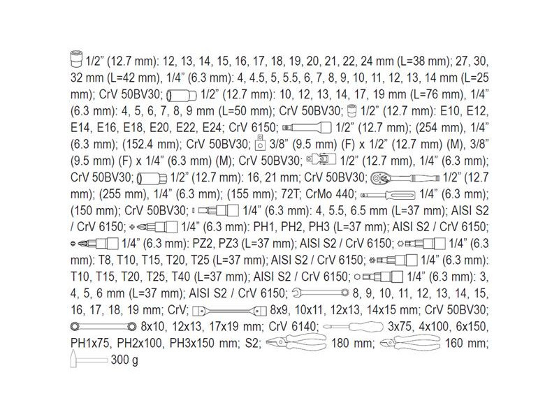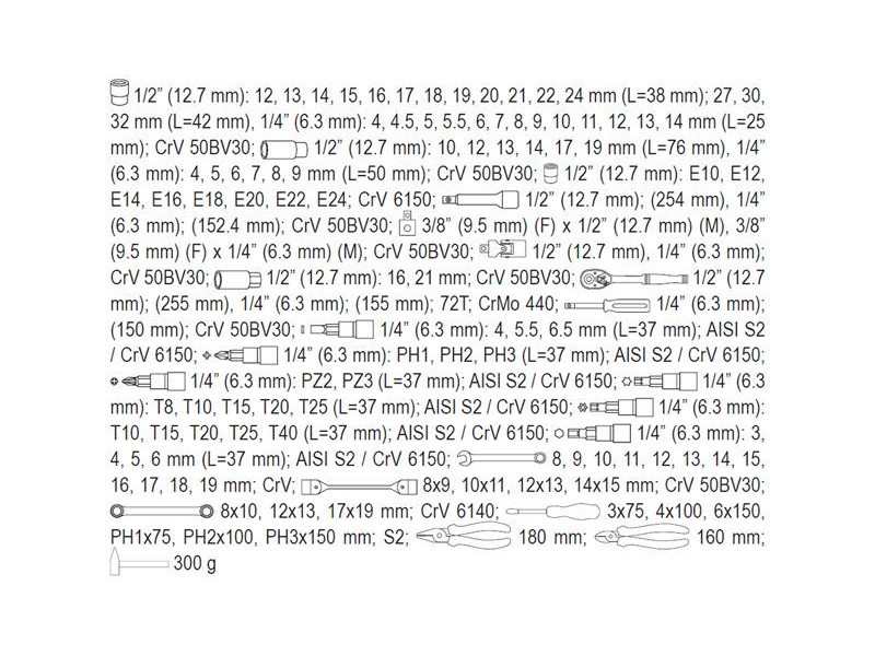 A professional tool set, which was developed for the needs of specialized car and mechanical services. The socket wrenches and the drive of the attachment were made of durable, tool-vanadium steel CRV 50BV3. The attachments were made using the matrix method, and before the hardening process they were calibrated with precise fittings and control devices. The attachments equipped with the AS-Drive system, increasing the maximum moment by 25%, with full protection of the cutter of the caps, the attachment with a two-tone surface finish. The kit also includes bits made of hard S2 steel. The set enables work that requires very high loads and precision, allows you to perform many service activities related to unscrewing and screwing threaded connections of various nominal sizes. Ratches have a triangular handle and 72 teeth (5 degrees working stroke).