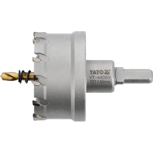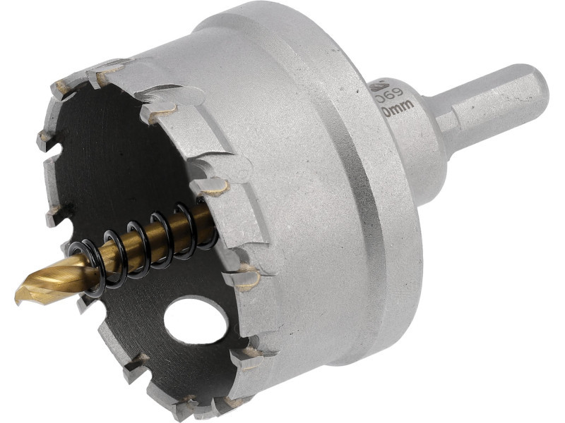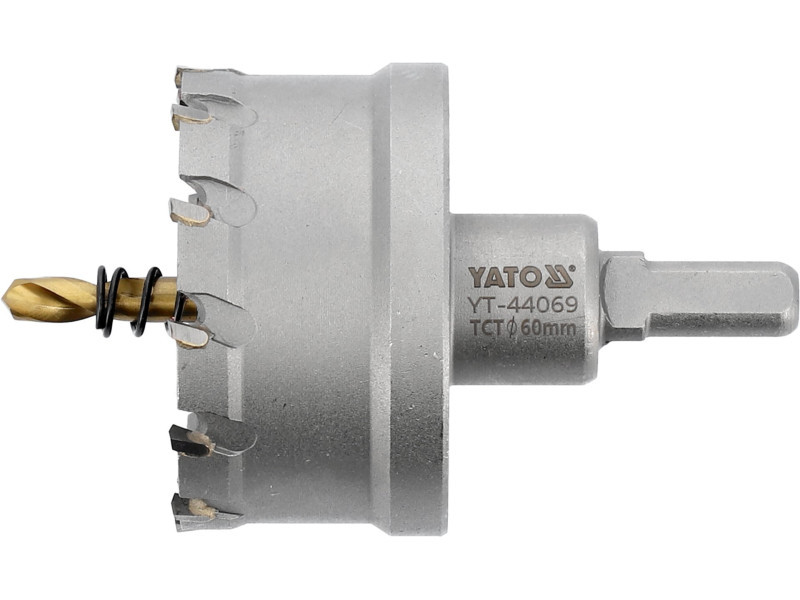 Diameter: 60MM, CUTTING DEPTH: 25MM, TOTAL LENGTH: 103MM, Sintered carbide YG10X, CORE MATERIAL: CARBON STEEL, PILOT DRILL MATERIAL: HSS4341 TIN, SIZE: 6MM, HEX-10MM HANDLE, 1 PACK. ALLEN WRENCH, 1PC. EXHAUSTING SPRING, APPLICATION: CONSTRUCTIVE STEEL (HEA, HEB TOWERS, ELECTRICAL DISTRIBUTORS, GAS BOXES), STAINLESS STEEL, Plastic (ABS, PE, PVC, ALSO reinforced with glass fiber) .