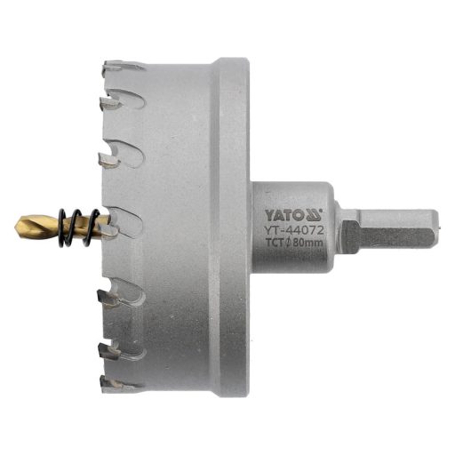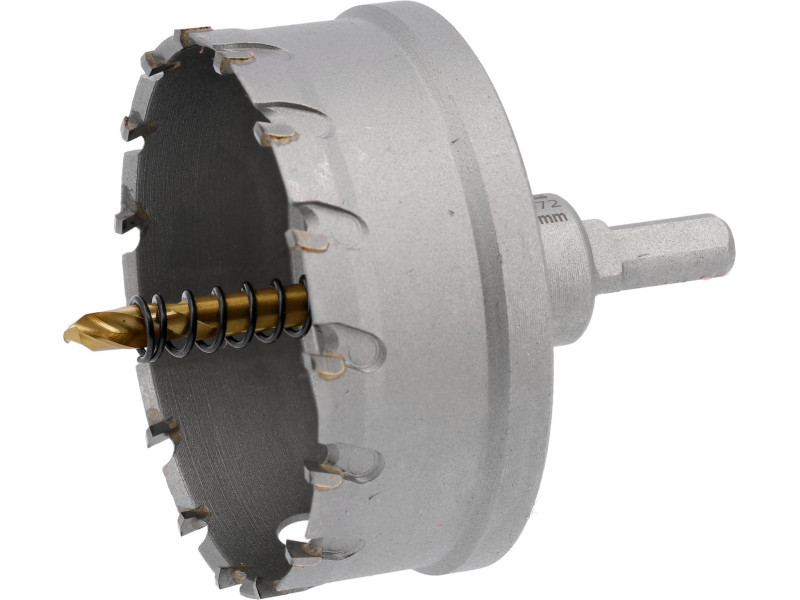 Diameter: 80MM, CUTTING DEPTH: 25MM, TOTAL LENGTH: 103MM, Sintered Carbide YG10X, CORE MATERIAL: CARBON STEEL, PILOT DRILL MATERIAL: HSS4341 TIN, SIZE: 6MM, HEX-10MM HANDLE, 1 PACK. ALLEN WRENCH, 1PC. EXHAUSTING SPRING, APPLICATION: CONSTRUCTIVE STEEL (HEA, HEB TOWERS, ELECTRICAL DISTRIBUTORS, GAS BOXES), STAINLESS STEEL, Plastic (ABS, PE, PVC, ALSO reinforced with glass fiber) .