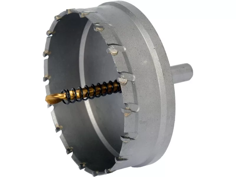 Diameter: 102MM, CUTTING DEPTH: 25MM, TOTAL LENGTH: 103MM, Sintered Carbide YG10X, CORE MATERIAL: CARBON STEEL, PILOT DRILL MATERIAL: HSS4341 TIN, SIZE: 6MM, HEX-10MM HANDLE,  1 PACK. ALLEN WRENCH, 1PC. EXHAUSTING SPRING, APPLICATION: CONSTRUCTIVE STEEL (HEA, HEB TOWERS, ELECTRICAL DISTRIBUTORS, GAS BOXES), STAINLESS STEEL, Plastic (ABS, PE, PVC, ALSO reinforced with glass fiber) .