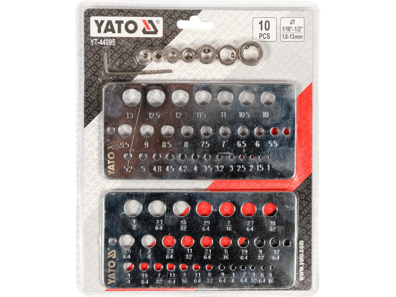 Gauges are used for quick initial check of outside diameters /e.g. drills , shafts , rods , wires etc Ring-shaped drill depth stops , when put on the drill , allow precise control of the depth of the drilled hole. The stops are put on the drill, determining the appropriate depth of drilling / the ring should be locked on the drill / Checking the diameter of the test piece / e.g. nail, rod, shaft / we put it in such a hole in which it can be moved with minimal clearance The diameter is given on the plate next to the hole The set includes two control plates and drilling depth stops - turned, steel with locking screw fi 3 / 4 / 5 / 6 / 8 / 10 / 12 mm and one key inbus 1.5 mm.