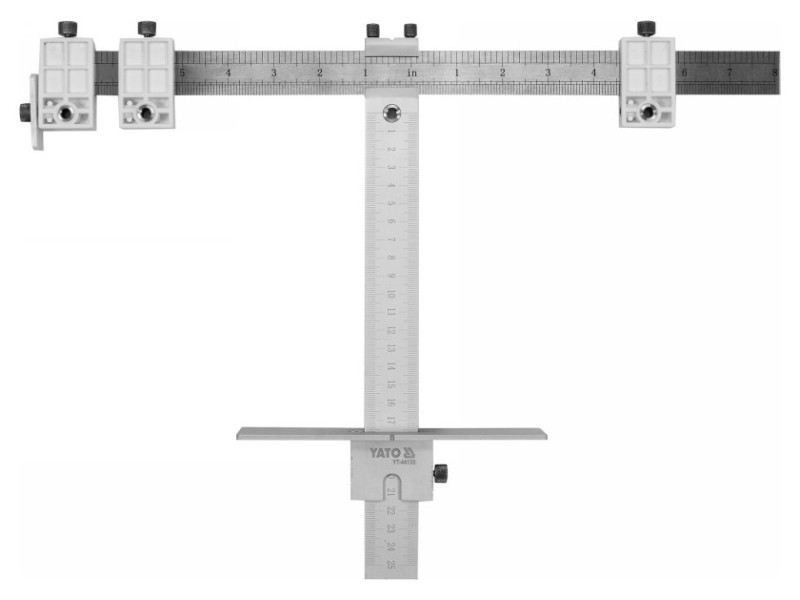 Template, guide for determining drilling points. The main arm made of aluminum, has a permanently applied millimeter scale up to 250 mm and a movable, blocking parallel limiter. A movable, steel strip is installed in the upper part, on which three sliding markers are placed for the appointed designation of drilling points. The template is intended for precise designation of points where we will drill the holes. At the same time, we can designate four holes at different distances from each other and block the settings to maintain the repeatability of the choice., I.e. select the same configuration, e.g. on a different material. The template makes it easier to rub on various materials, e.g. wood, metal, plastics, etc., depend depending on the needs of the distance between the markers and block them with blocking screws. Then set the parallel strip determining the distance from the edge of the workpiece. Using the marker, pencil or point, mark the drilling site on the material.