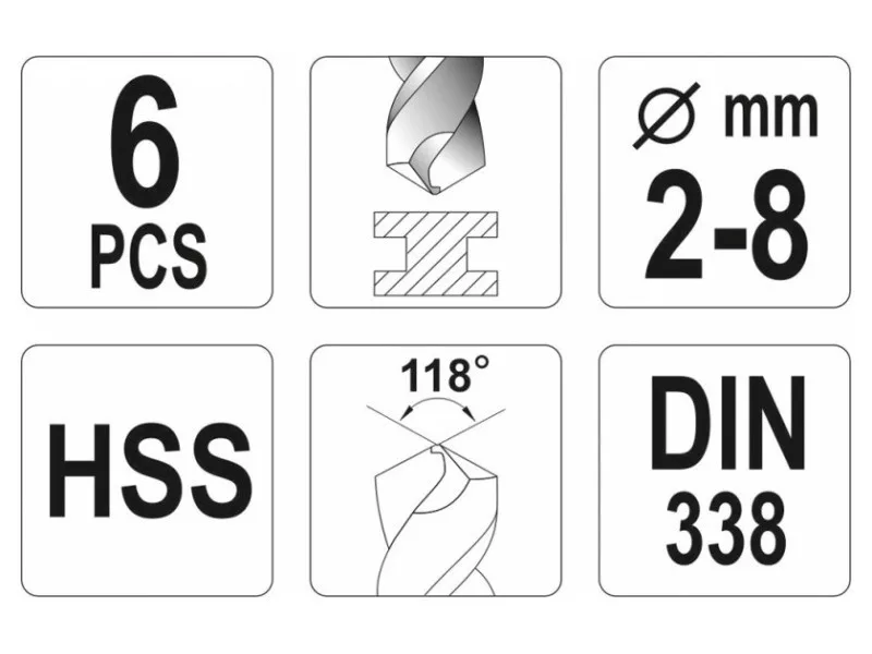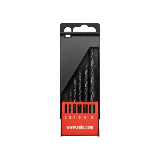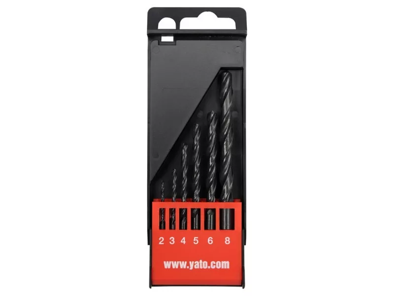 A set of YATO metal metal drills. Made of high quality high -speed steel with a HSS symbol, ended with a cylindrical handle. Drills with reinforced cutting edge and 118 ° vertex angle. Designed for use in industry and craft, for precise drilling in steel, iron, metals, plastics. The set includes 6 drills with a diameter [mm]: 2, 3, 4, 5, 6, 8