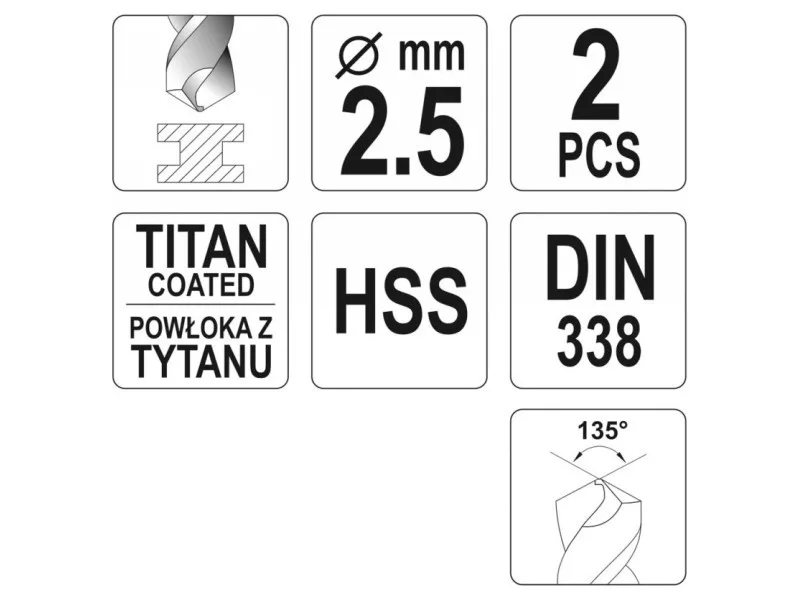 A ground drill with aggressive blade geometry. Thanks to the titanium nitride coating, it drains heat very efficiently and does not move when working in hard steel species. The blade attack angle of 135 ° allows drilling even without prior use of a point. Made according to the DIN 338 standard for professional applications in industry. A drill with a cylindrical handle designed for standard self -stacking drilling holders and key. High pressure resistance also allows the use of column and magnetic drills.