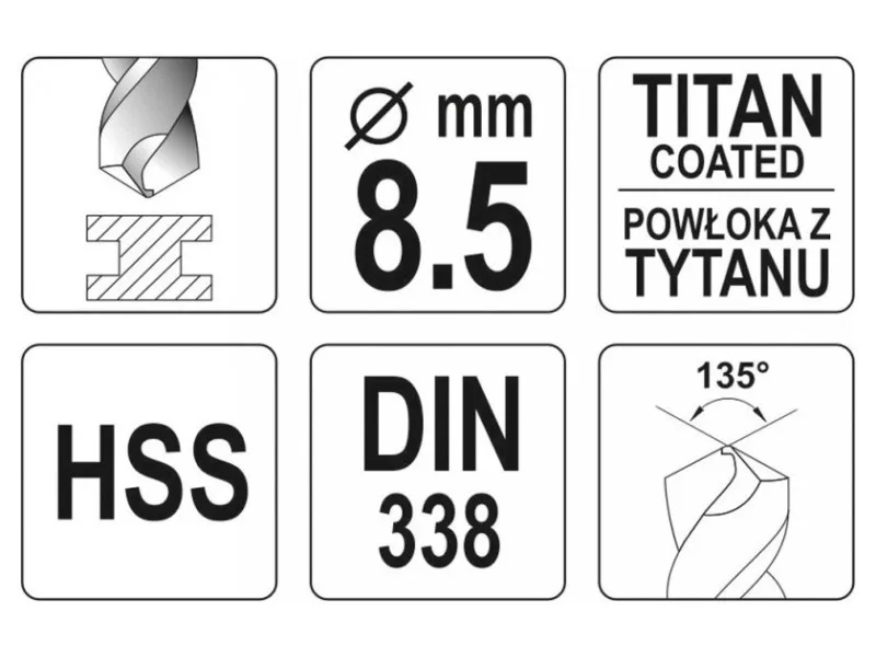A ground drill with aggressive blade geometry. Thanks to the titanium nitride coating, it drains heat very efficiently and does not move when working in hard steel species. The blade attack angle of 135 ° allows drilling even without prior use of a point. Made according to the DIN 338 standard for professional applications in industry. A drill with a cylindrical handle designed for standard self -stacking drilling holders and key. High pressure resistance also allows the use of column and magnetic drills. Drilling in high -quality steel, including stainless, structural and cold rolled. Drilling without the need for scoring, thanks to the aggressive geometry of the blade. Quick heat dissipation allows you to work without the use of a cooling factor, without causing a drill burning.
