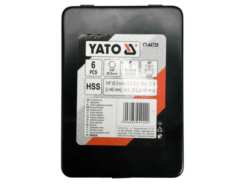 A set of deepered metal deepered by Yato YT-44729. Made of high -speed HSS steel. Intended for professional applications - drilling in hard and hard -boring materials. • HSS steel provides several times faster drilling in stainless steel, structural, aluminum • 5-tight vertex "Split Point" with a 45 ° angle allows drilling without prior scoring • The sanded surface increases drilling precision • durable and resistant to damage and raining • a hexagonal handle • hexagonal handle HEX ction allows mounting to battery screwdrivers and stroke keys. Dredgers: 6.3 8.3 10.4 12.4 16.5 20.5