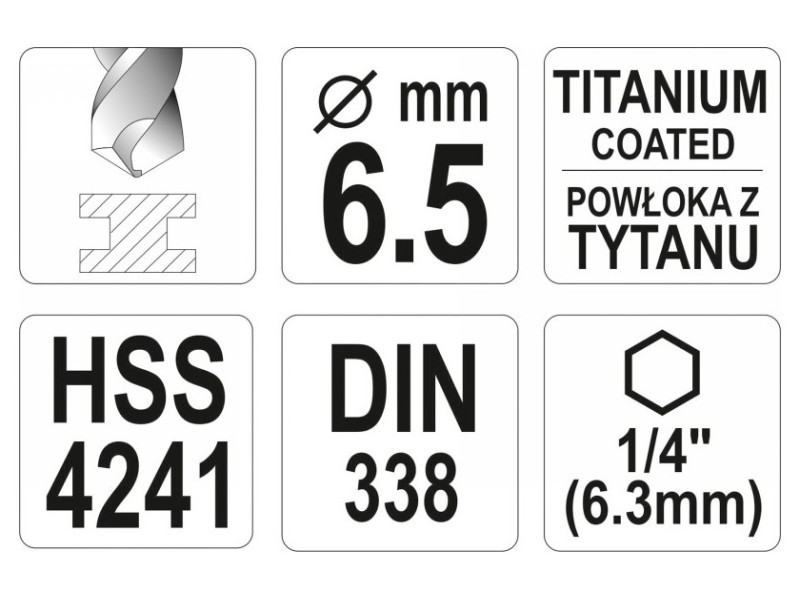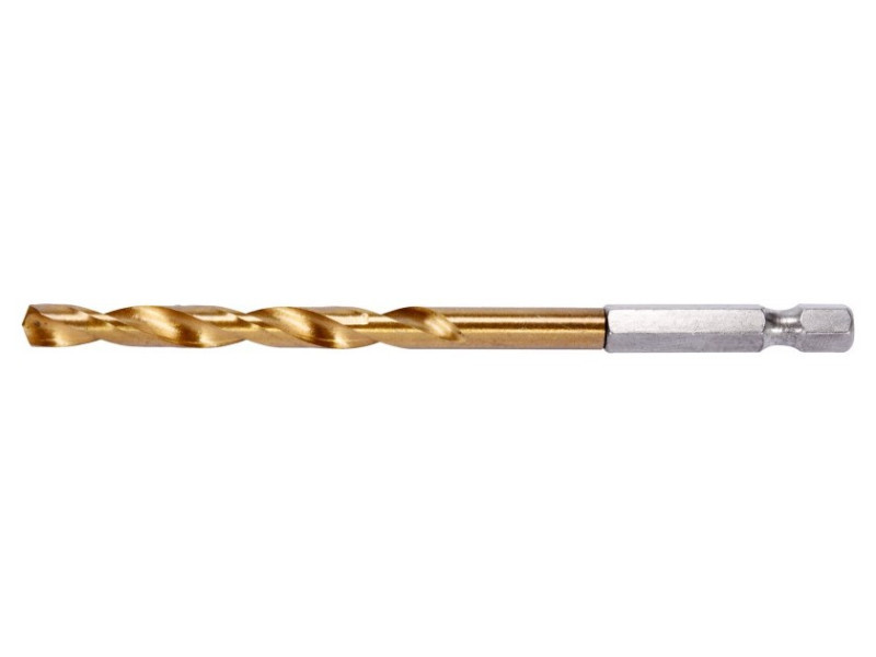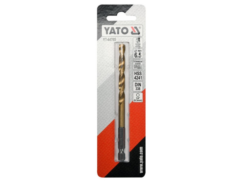 Titanium-coated metal drill bit with hexagonal shank by YATO YT-44765.Made of high-speed HSS steel, titanium-coated. Split point allows drilling without prior scoring. The edges of the drill bit are ground. Point angle of 135 degrees. Quickly dissipate heat when drilling in hard steels without burning the drill bits. Dedicated to professional applications, drilling in high-grade stainless steel, structural steel, and cold-rolled steel.