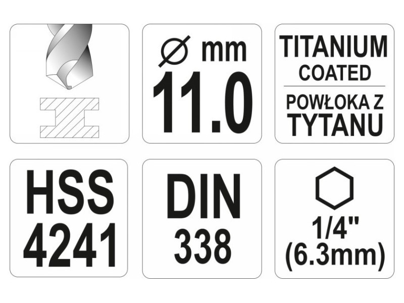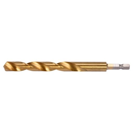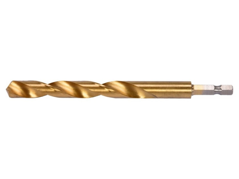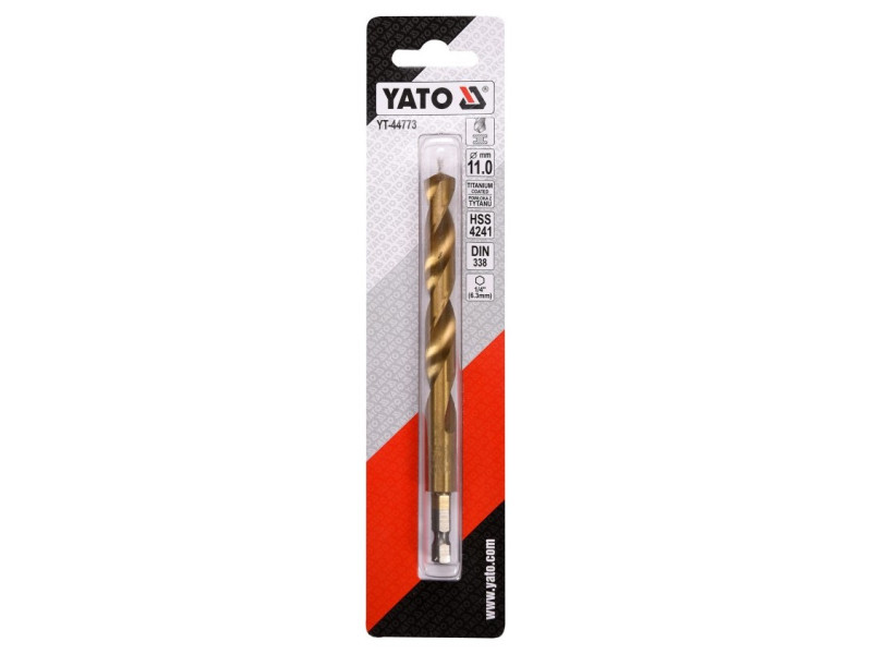 Titanium-coated metal drill bit with hexagonal shank by YATO YT-44773.Made of high-speed HSS steel, titanium-coated. Split point allows drilling without prior scoring. The edges of the drill bit are ground. Point angle of 135 degrees. Quickly dissipate heat when drilling in hard steels without burning the drill bits. Dedicated to professional applications, drilling in high-grade stainless steel, structural steel, and cold-rolled steel.