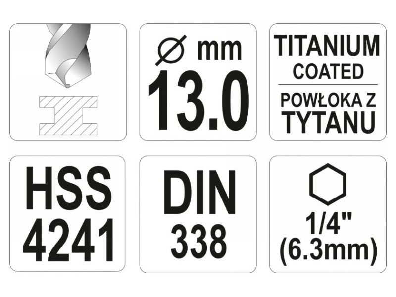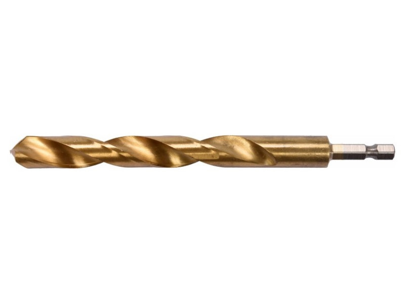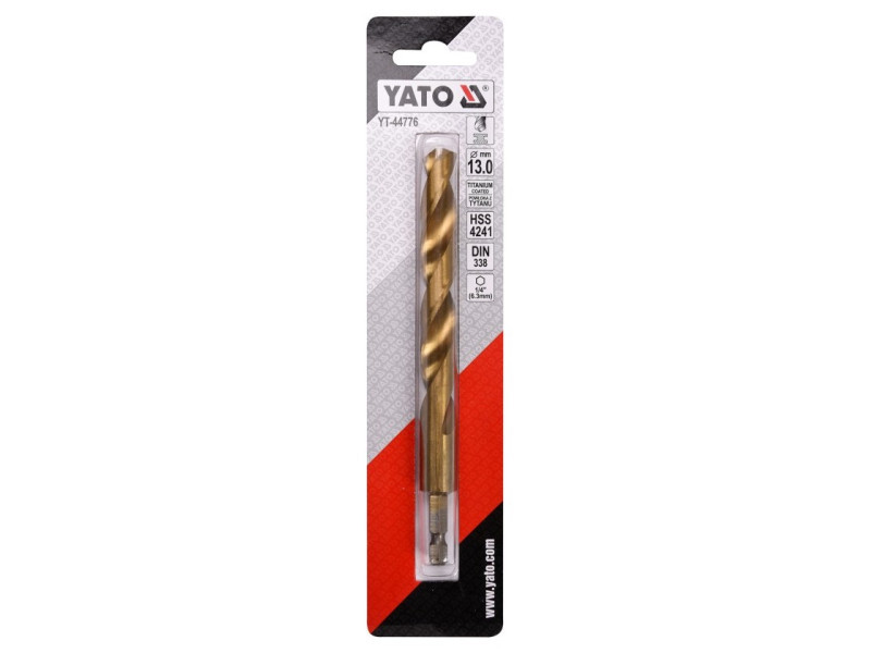 Titanium-coated metal drill bit with hexagonal shank by YATO YT-44776.Made of high-speed HSS steel, titanium-coated. Split point allows drilling without prior scoring. The edges of the drill bit are ground. Point angle of 135 degrees. Quickly dissipate heat when drilling in hard steels without burning the drill bits. Dedicated to professional applications, drilling in high-grade stainless steel, structural steel, and cold-rolled steel.